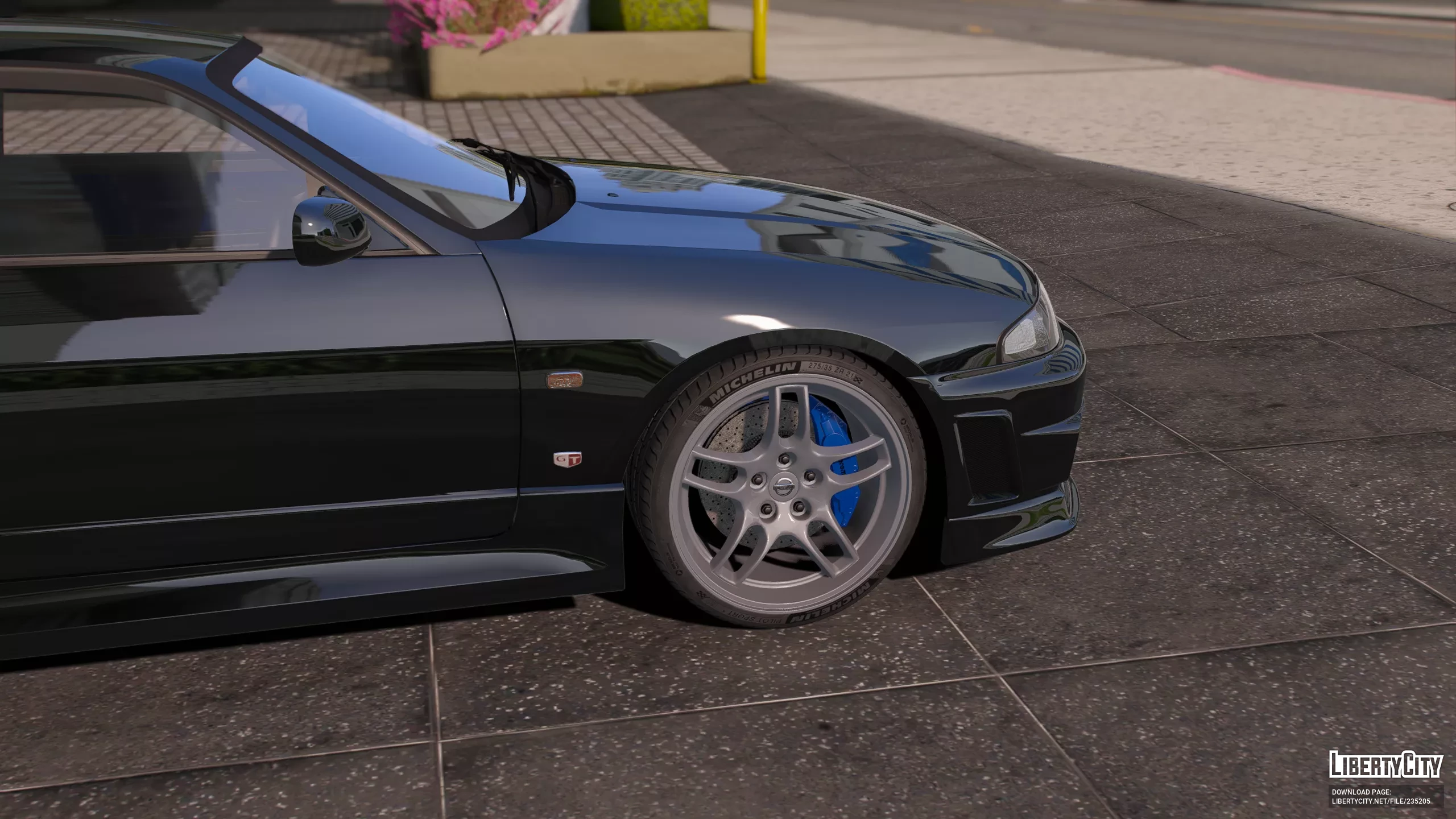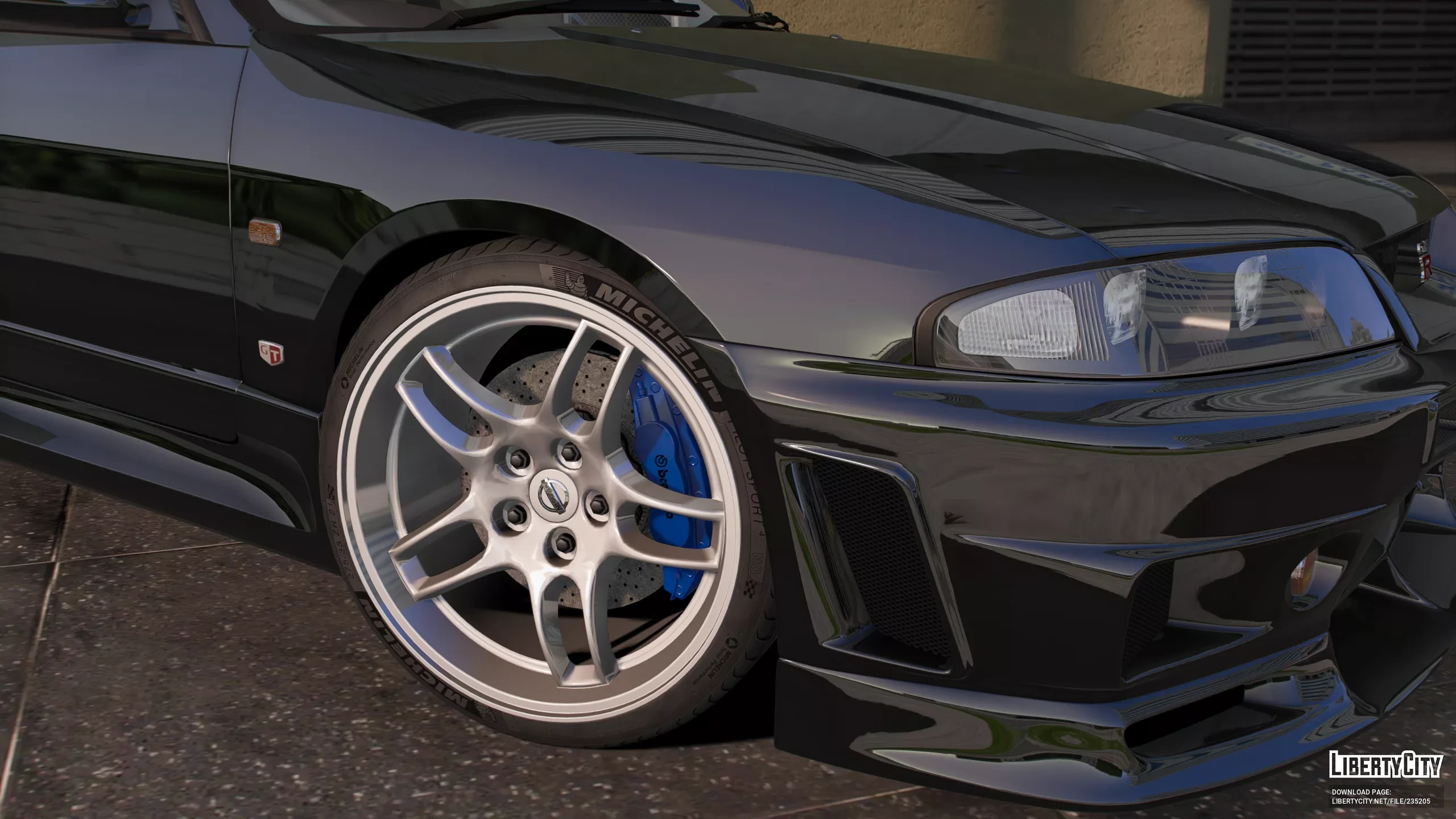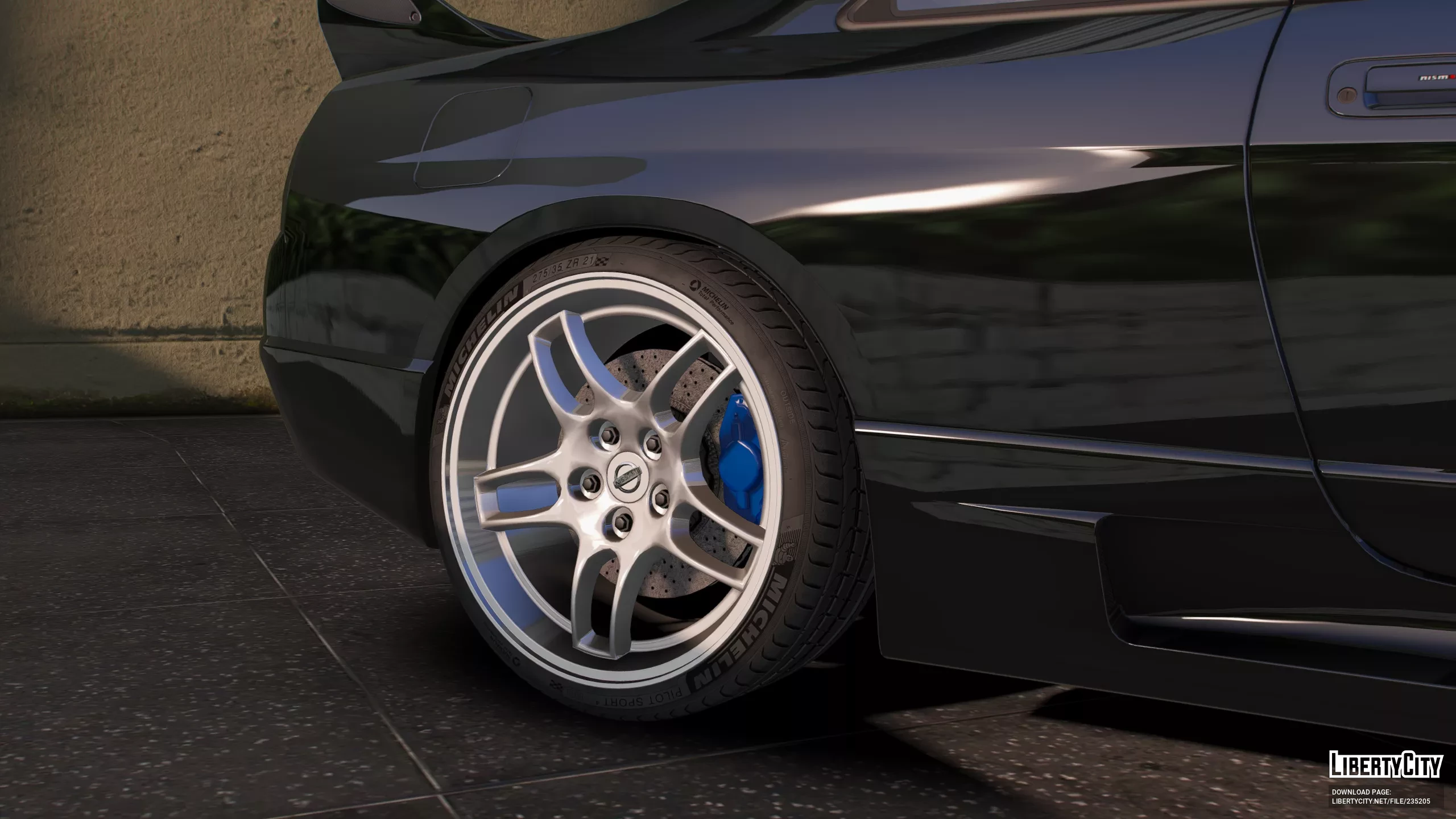 Колёса Nissan GT-R R33 выполнены в классическом спортивном стиле с пятью двойными спицами, придающими автомобилю агрессивный и динамичный вид. Диски имеют фирменный логотип Nissan в центре и доступны в различных цветах, включая серебристый и чёрный. Такая конструкция гармонично сочетается с мощными тормозными суппортами и подчёркивает гоночный характер автомобиля. Колёса отлично подходят для поклонников классического японского автоспорта и тюнинга.