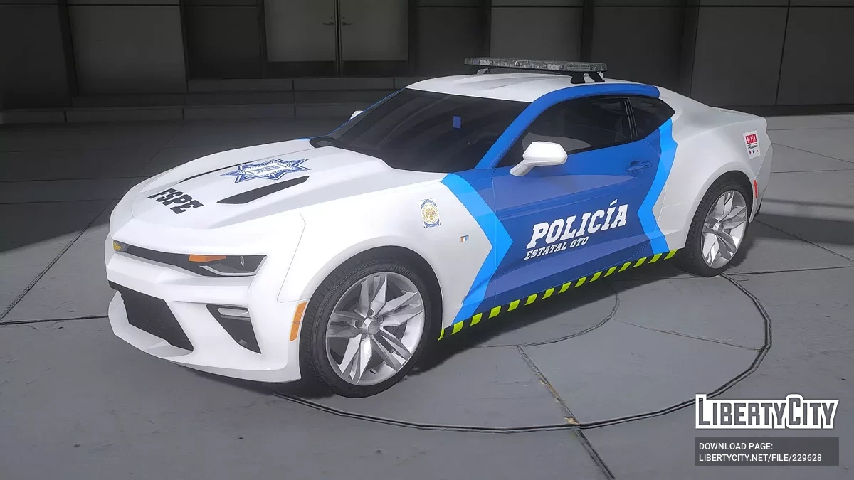 2016 Chevrolet Camaro Policía estatal Guanajuato Mx для GTA 5. Передняя часть: Капот украшен крупной эмблемой полиции штата Гуанахуато и надписью "FSPE", что подчёркивает служебное назначение автомобиля. Фирменная узкая решётка радиато...