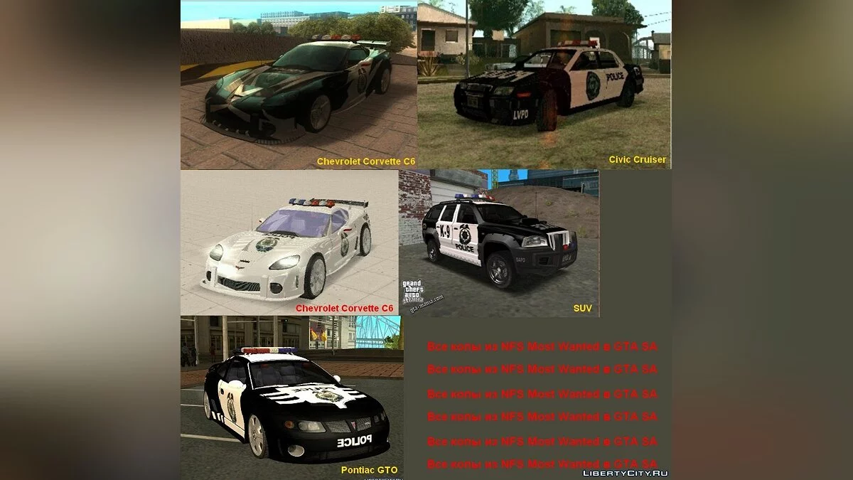 Полностью заменяет весь старый транспорт полиции на крутые авто из NFS Most Wanted Входят: Chevrolet Corvette C6 Police машина сержанта Крос из 5 возгорания и еще с конца игры. Chevrolet Сorvette С6 Рolice из 5 возгорание. Pontiac GTO Po...