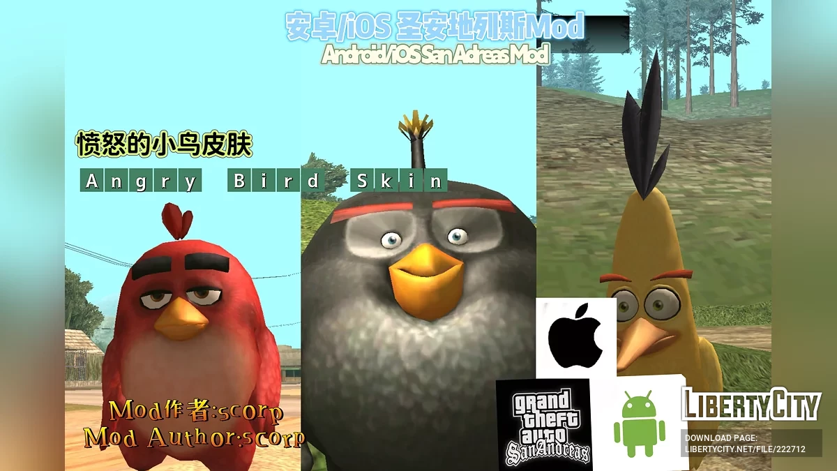 Мод заменяет трёх персонажей на птиц из Angry Birds: Truth → Красная птица; Maccer → Чёрная птица; Cesar → Жёлтая птица. Каждая модель имеет собственную текстуру и весит более 100 КБ. Установка: В ES File Explorer переименуйте .obb фа...