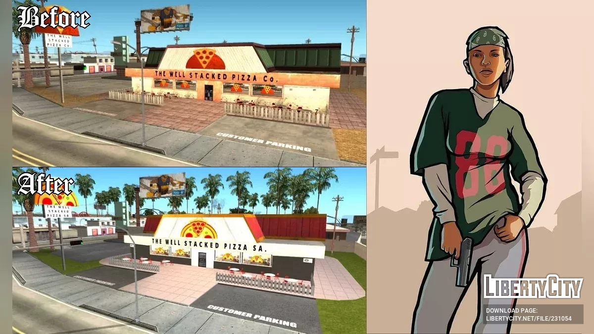 Вы устали от низкого разрешения и грязного внешнего вида стандартной «The Well Stacked Pizza Co.» в Сан-Андреасе? Этот мод обеспечивает полную визуальную трансформацию, превращая каждое место в Сан-Андреасе в четкую, современную и высококачественную франшизу: «The Well Stacked Pizza SA». Используя высококачественные текстуры и усовершенствованные модели, этот ремонт заменяет устаревшую эстетику 2004 года на четкий, современный вид, который идеально подходит для вселенной GTA San Andreas (улучшенный стиль SA). Обратите внимание на заметную разницу в подробных сравнительных изображениях, от блестящей красной кровли до тщательно спланированного ландшафта.