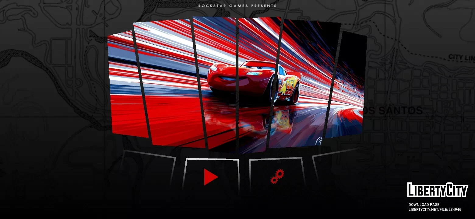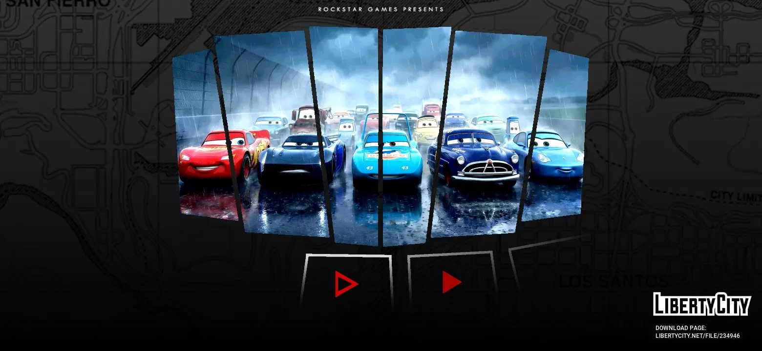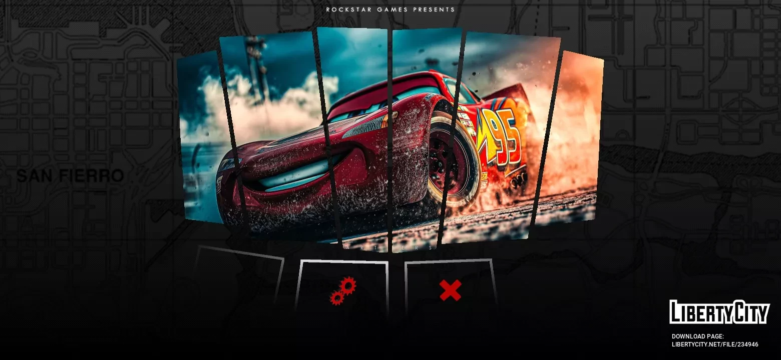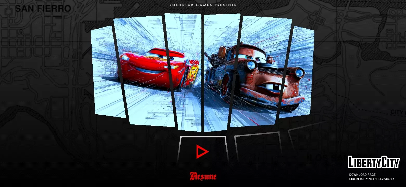 Мод добавляет улучшенный экран загрузки в 8K для GTA San Andreas, представляя собой мультяшных персонажей из "Машины на дороге", выполненных с использованием специального шрифта и ярких красных иконок.