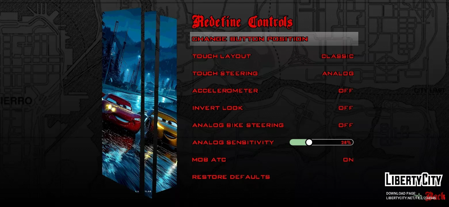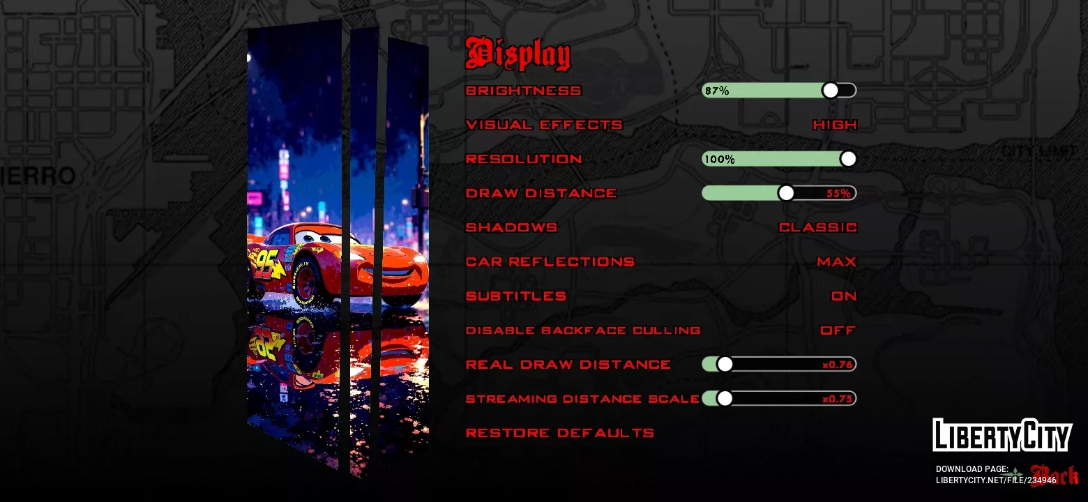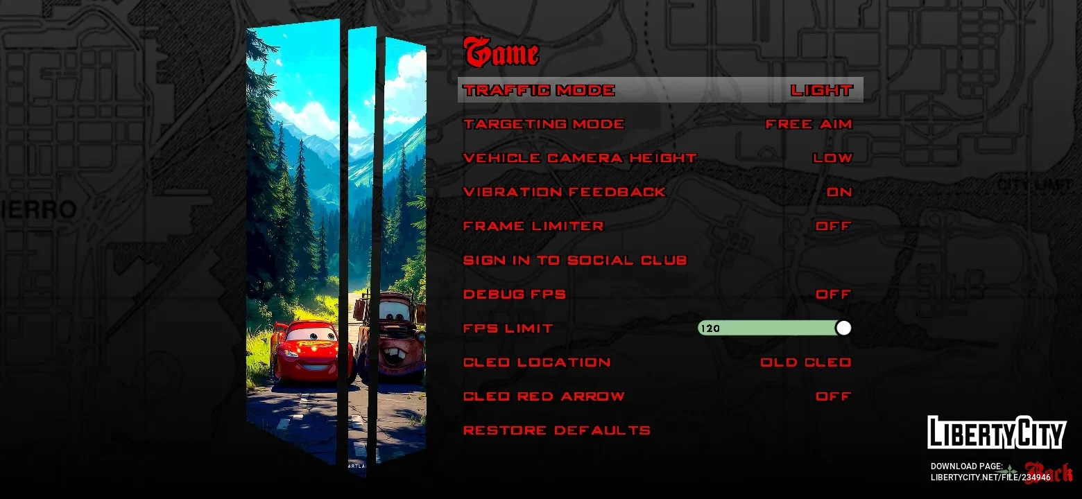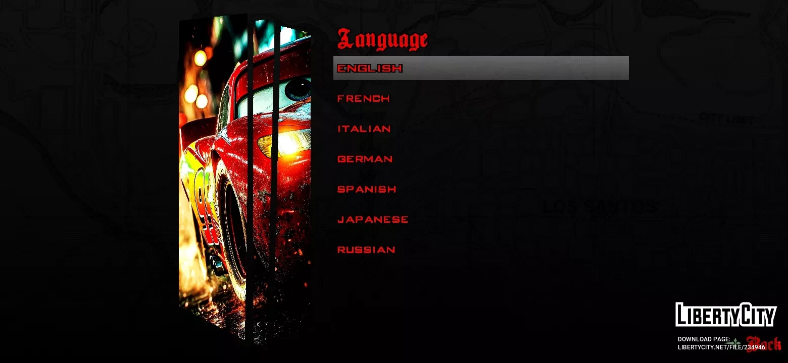 Мод добавляет улучшенный экран загрузки в 8K для GTA San Andreas, представляя собой мультяшных персонажей из "Машины на дороге", выполненных с использованием специального шрифта и ярких красных иконок.