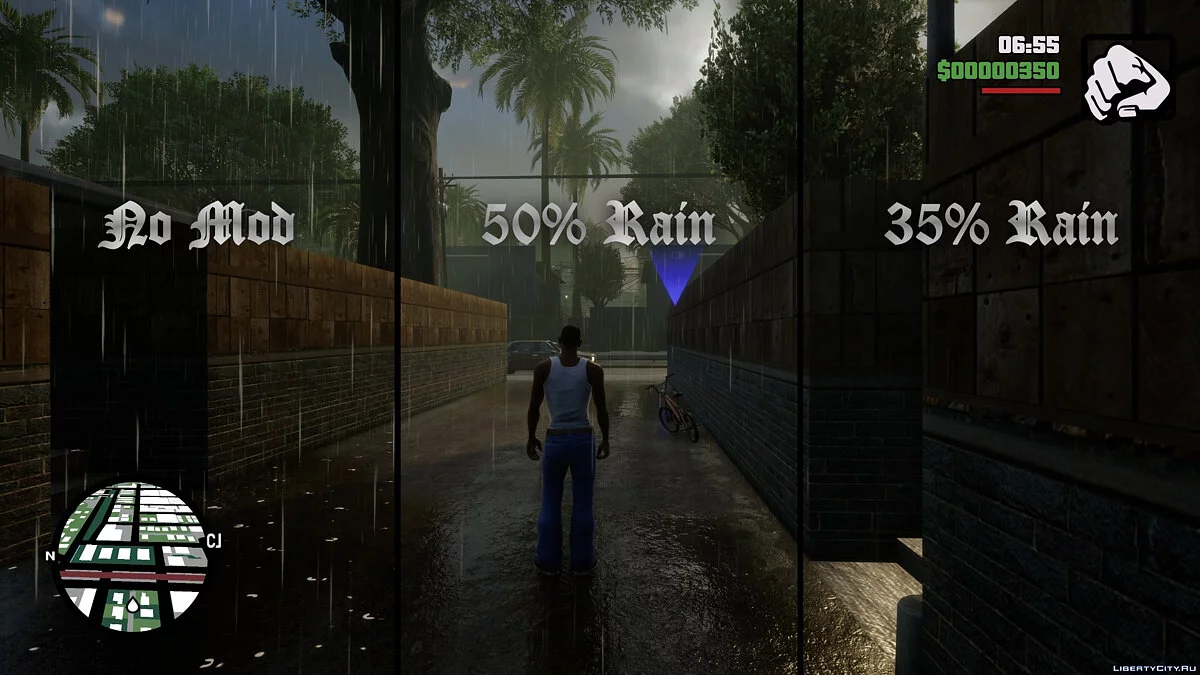 Обновление v1.3: Модификация работает для всех частей: GTA 3, Vice City и San Andreas; Теперь можно выбрать три варианта дождя: 65%, 50% и 35%; Идеально подходи для мониторов 1440p и выше; Удалите предыдущую версию (если у вас такова имее...