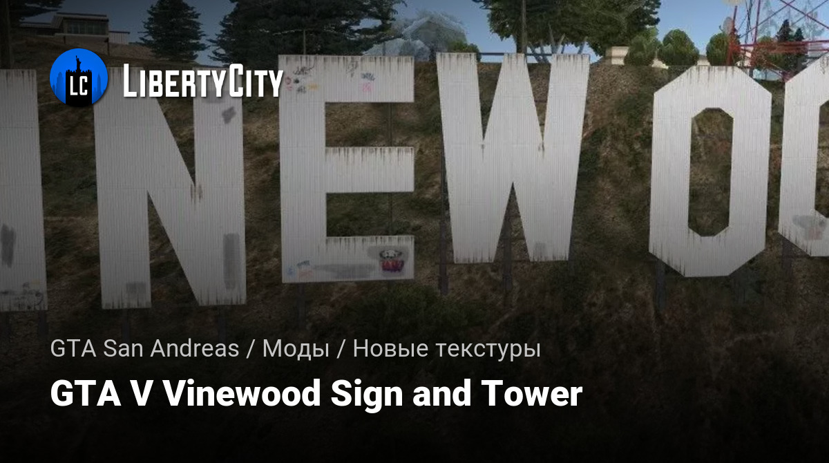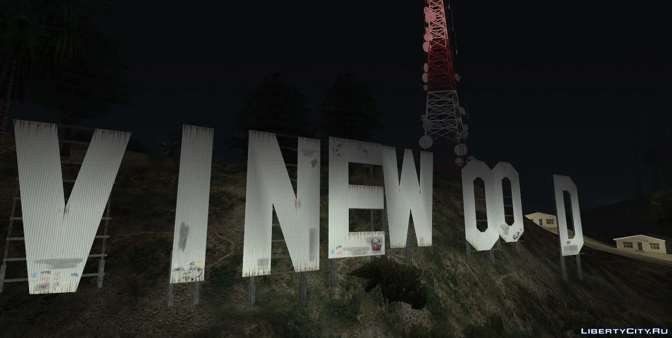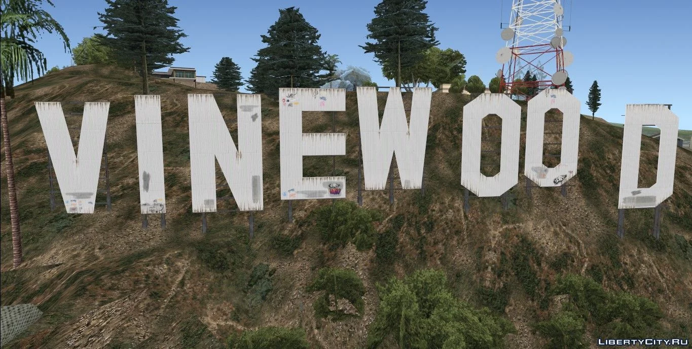Мод заменяет надпись \"Vinewood\" и вышку рядом с ней на аналогичные из GTA 5.