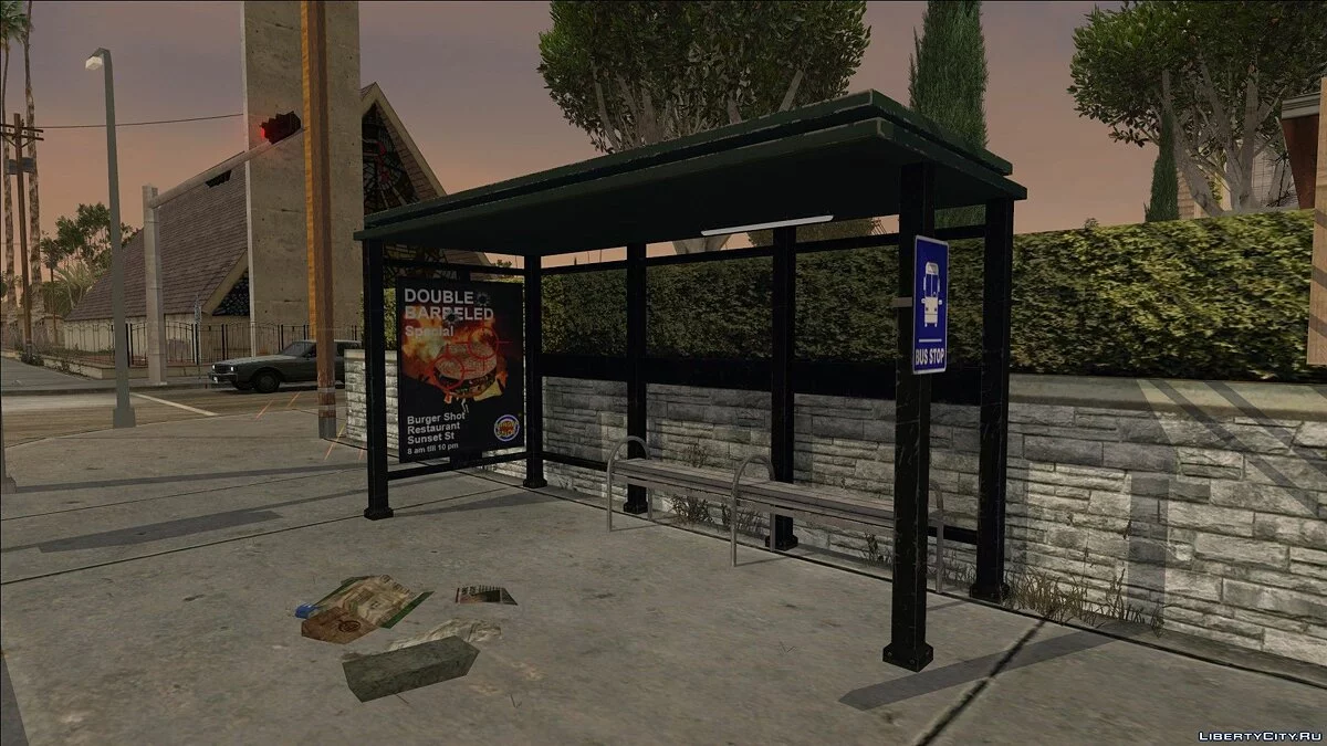 Стандартная автобусная остановка и знак в улучшенном качестве. Обновление v1.2: - Педы теперь сидят ровно и не висят в воздухе - Улучшено дневное и ночное освещение - Модель адаптирована к ENV отражениям из SkyGfx Особенности: - HQ модели и те...