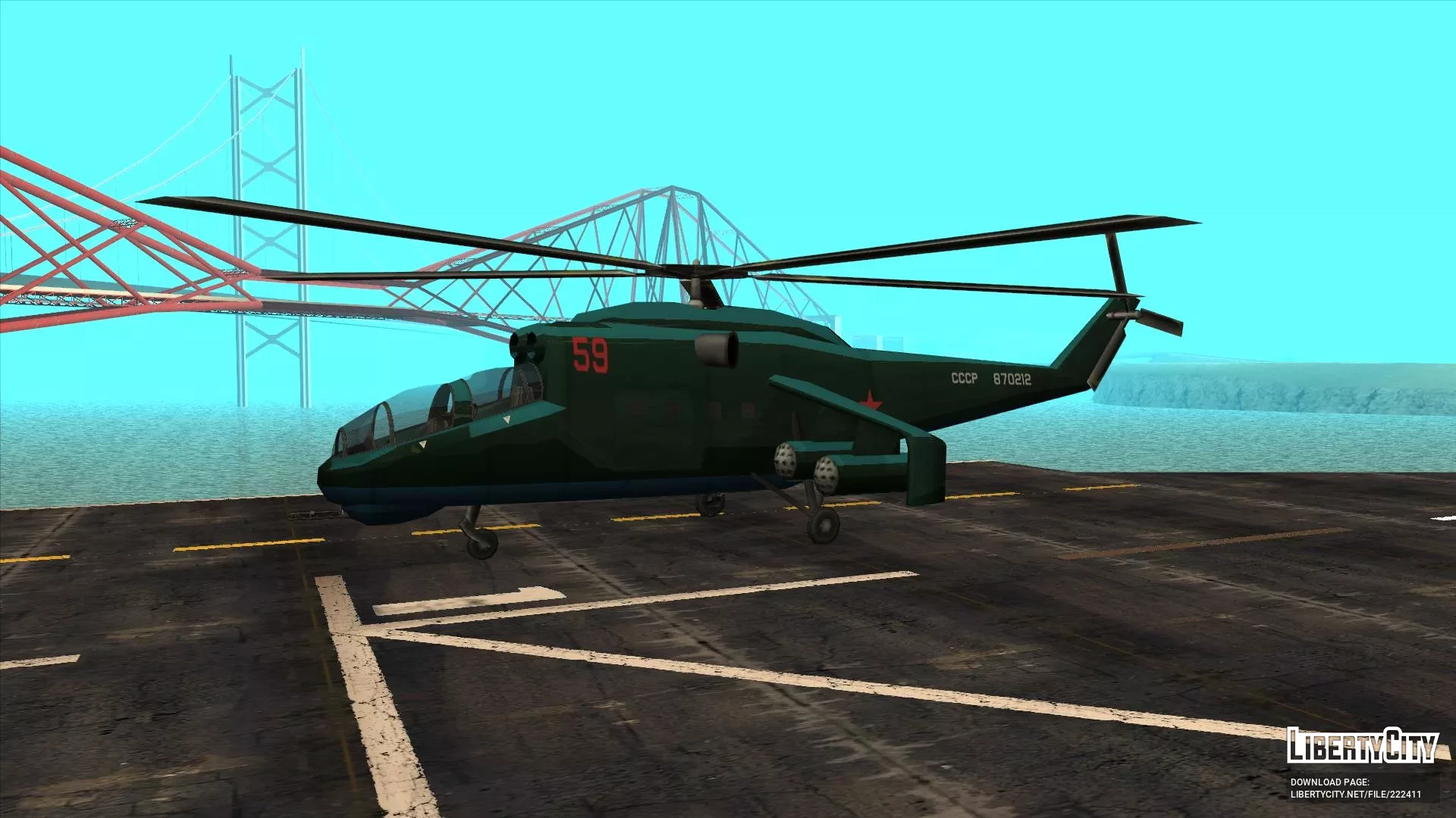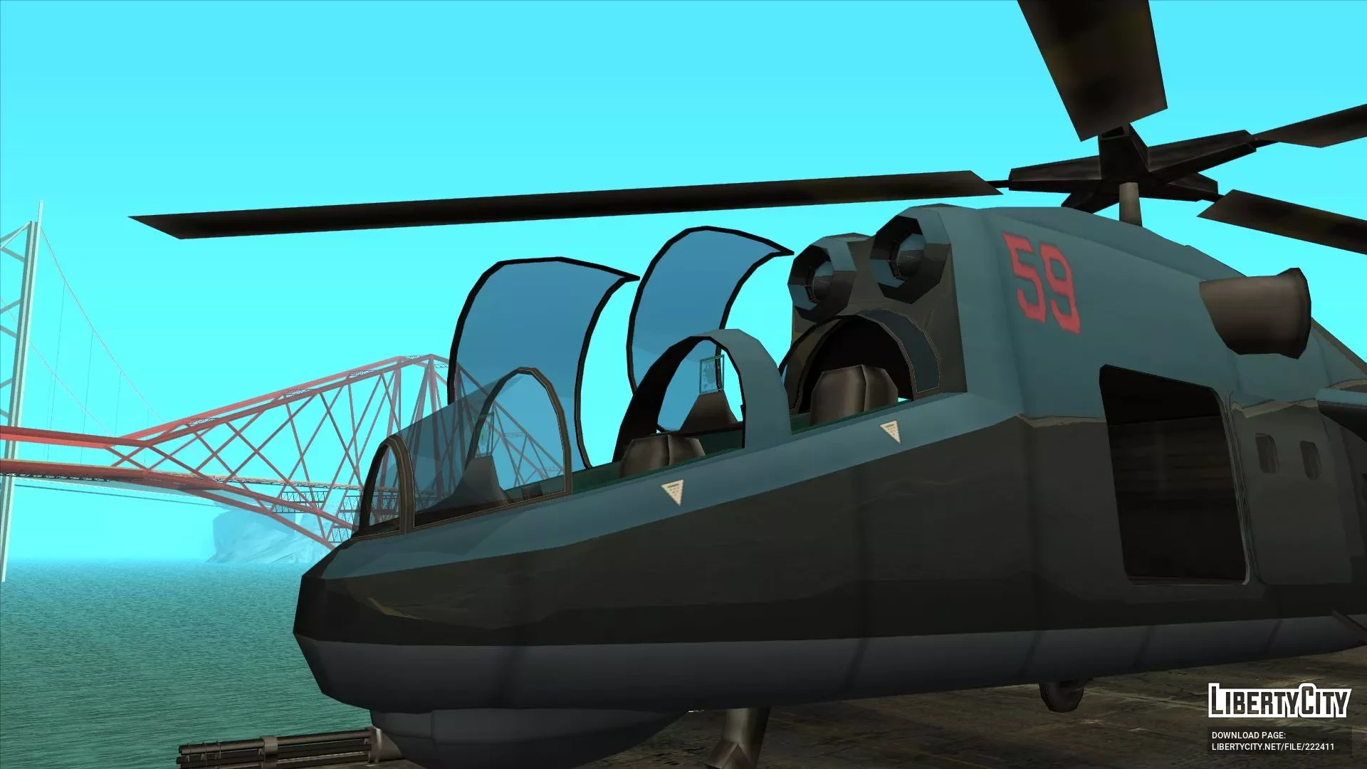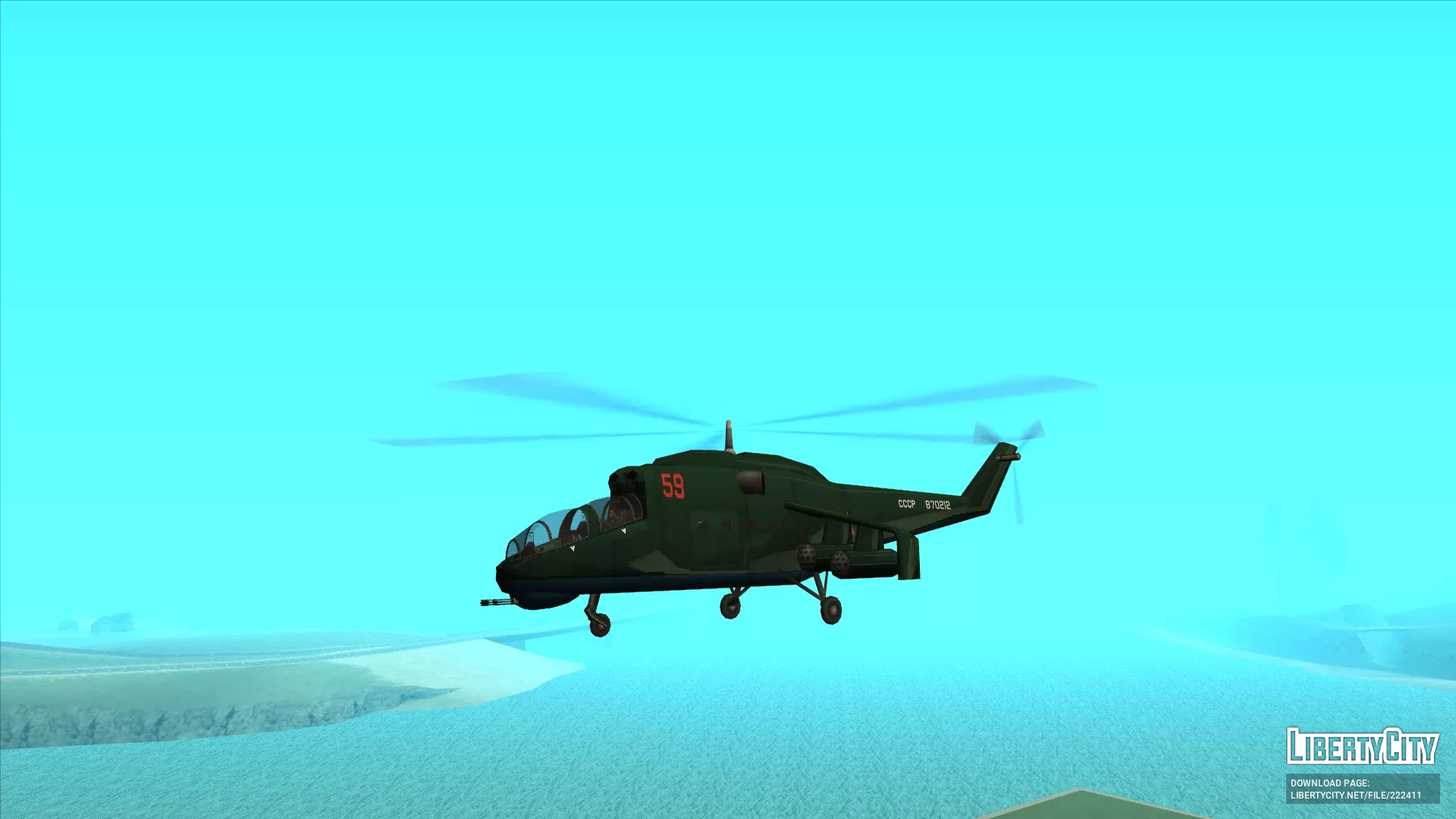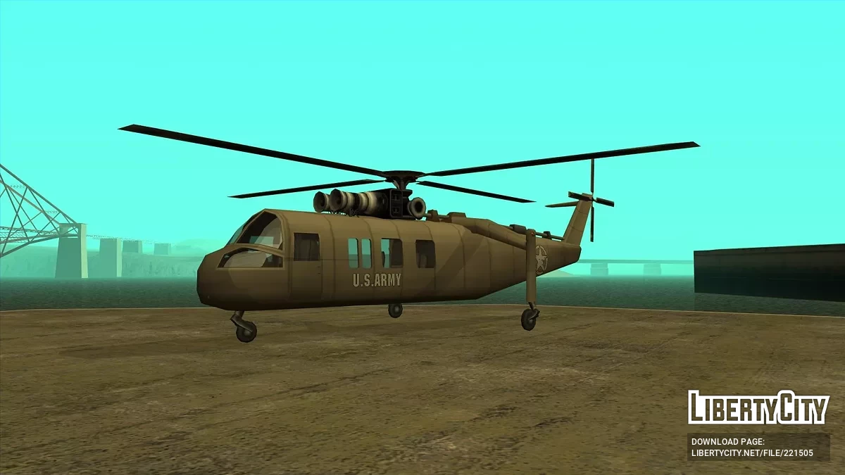 Сделан с нуля при использовании ассетов от Rockstar Games. Имеет стиль SA, собственные коллизию, LOD, тень. Создан на базе вертолета Миль Ми-24. От себя я добавил приборные панели плюс-минус срисованные с Ми-24 и шасси в стиле Ми-8 (я пока не знаю, как у вертолета сделать полноценно убирающиеся шасси).Корпус окрашивается в два цвета — первый применяется к большей части корпуса, второй к днищу.Установка: