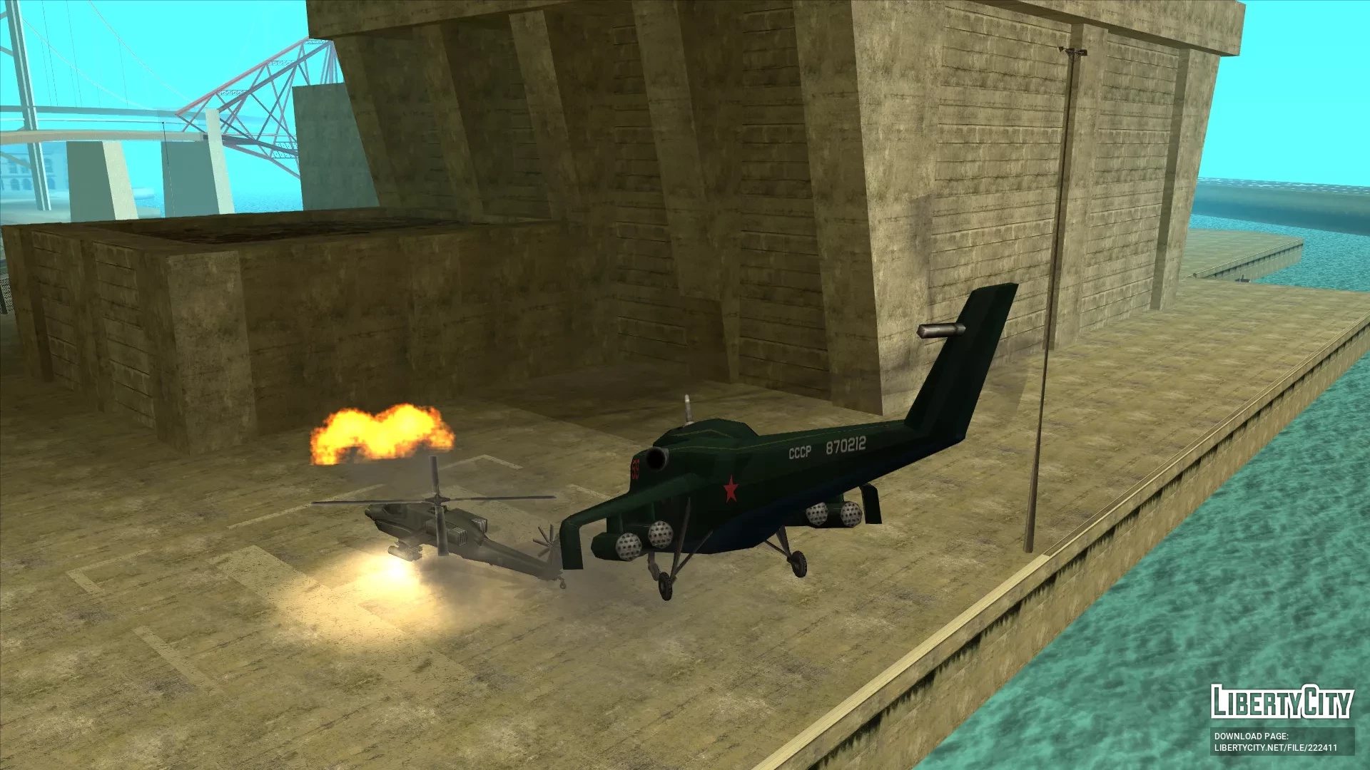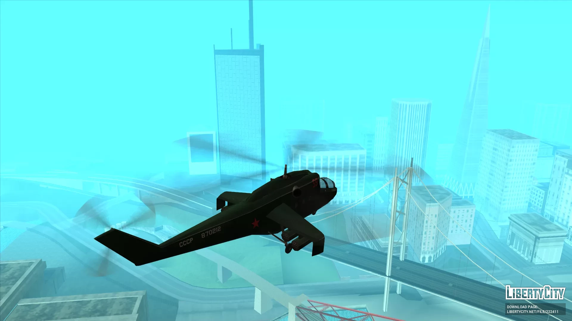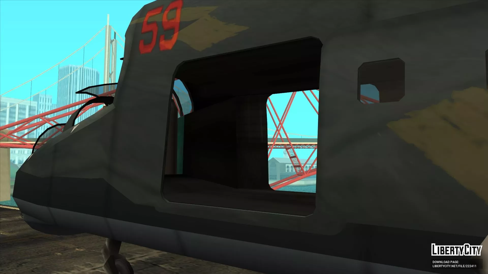 Сделан с нуля при использовании ассетов от Rockstar Games. Имеет стиль SA, собственные коллизию, LOD, тень. Создан на базе вертолета Миль Ми-24. От себя я добавил приборные панели плюс-минус срисованные с Ми-24 и шасси в стиле Ми-8 (я пока не знаю, как у вертолета сделать полноценно убирающиеся шасси).Корпус окрашивается в два цвета — первый применяется к большей части корпуса, второй к днищу.Установка: