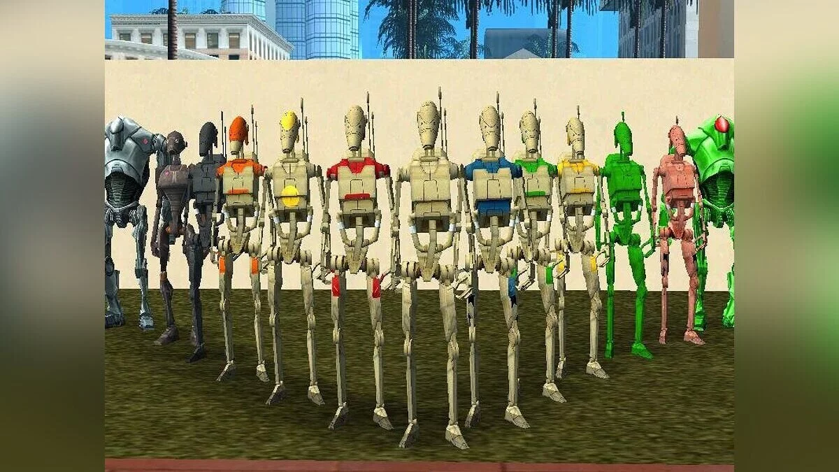 Куча дроидов с разными текстурами из Star Wars заменяют любых пешеходов.