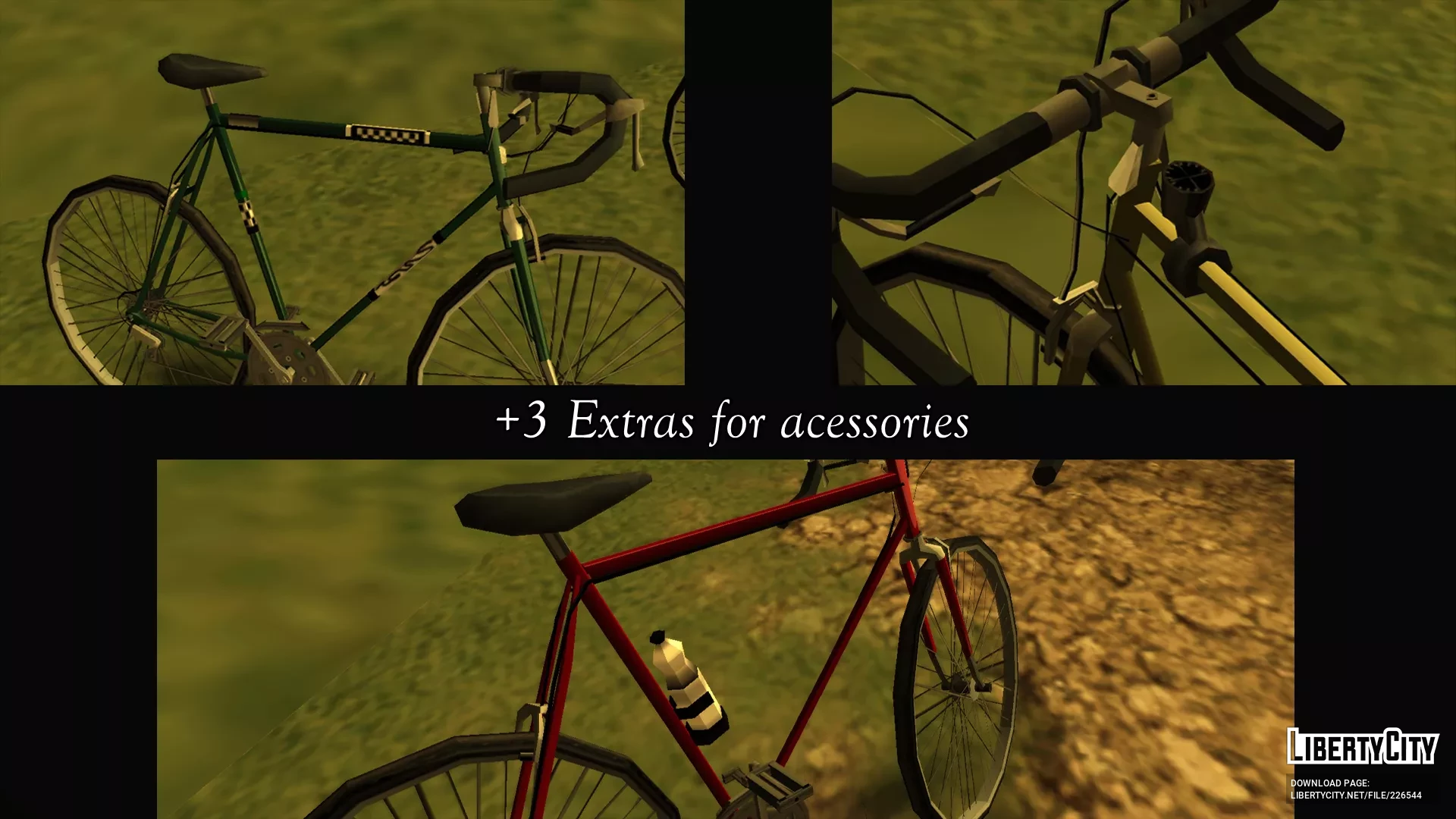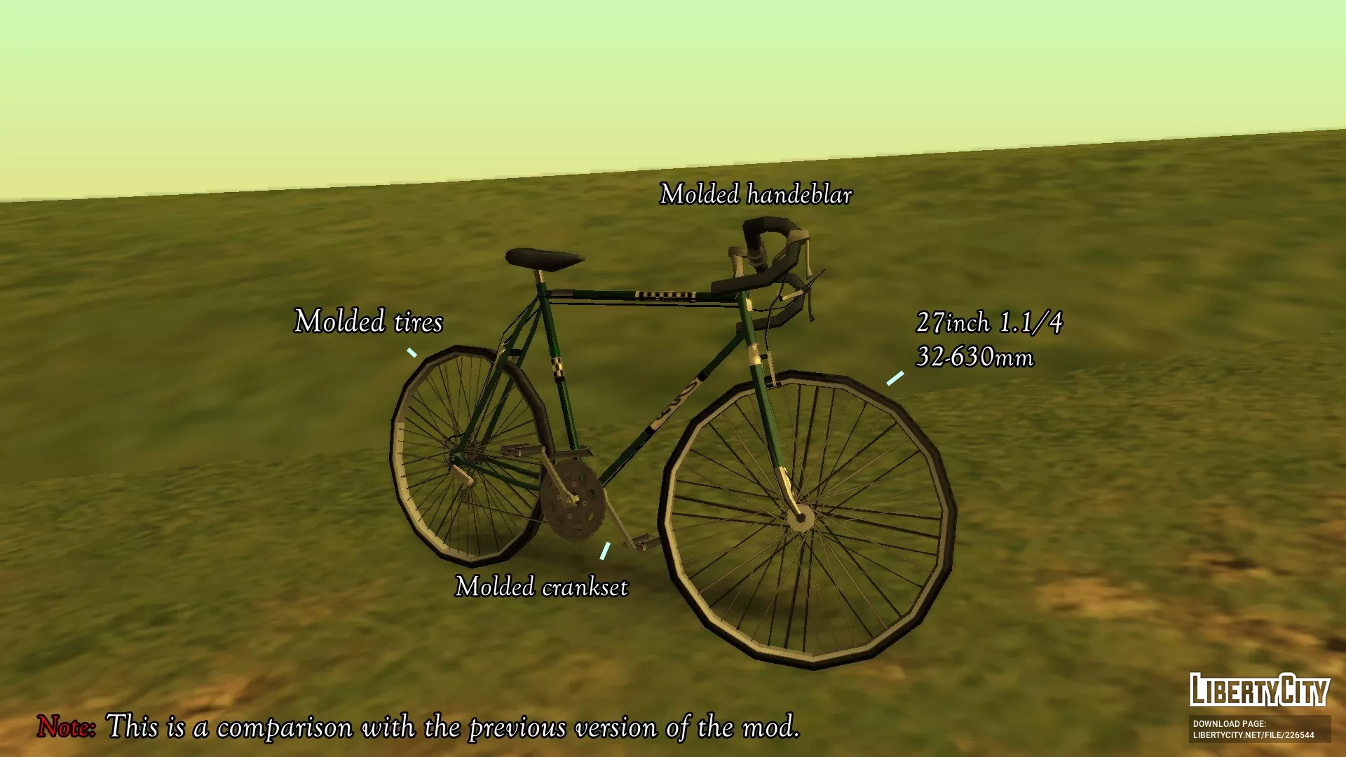 - Анимация: Теперь CJ крепко держит руль, в более центральном положении. Мы не можем позволить ему больше так делать, потому что его рука будет «раздавлена» манекенами Ped. Анимация остается такой же, как у горного велосипеда, но выглядит намного больше как у шоссейного.