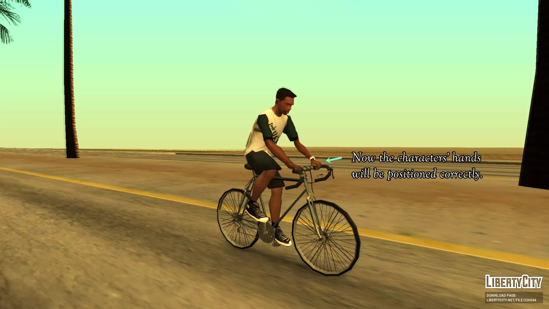 - Anim: Now CJ grips the handlebars firmly, in a more middle position. We can't let him get away with that any longer because his arm would be "crushed" by the Ped dummies. The animation remains that of a mountain bike, but with a look much more like a road bike.