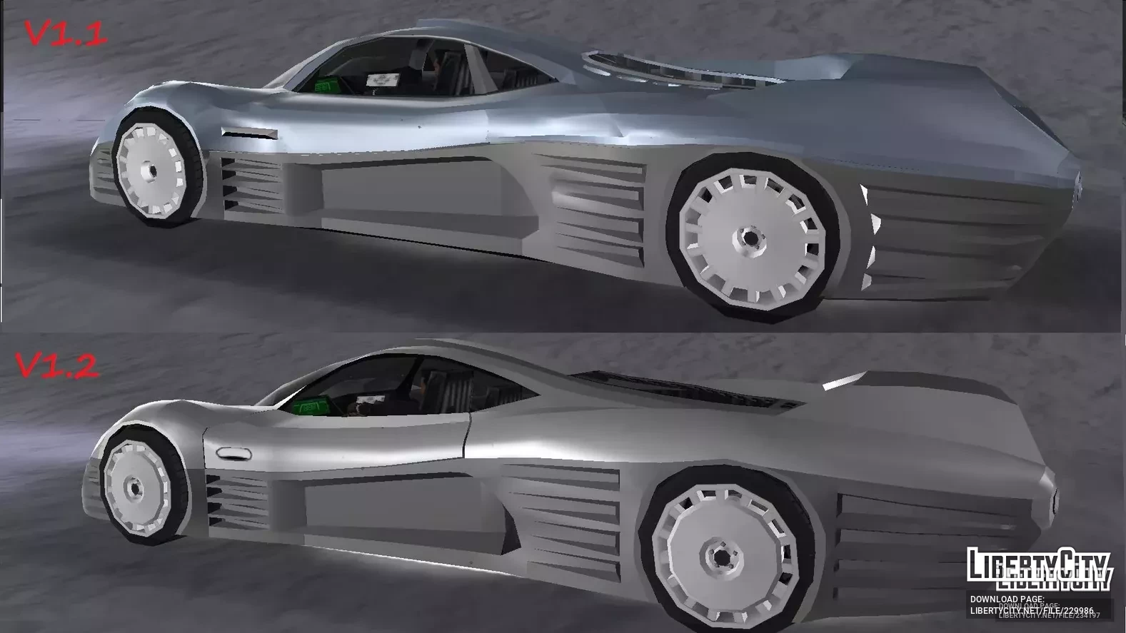 - Версия 1.1 (6 декабря 2025): Увеличенный размер, исправление геометрии кузова, фар, руля и спидометра, добавлена модель повреждения спойлера. Максимальная скорость увеличена до ~650 км/ч (нестабильное управление).