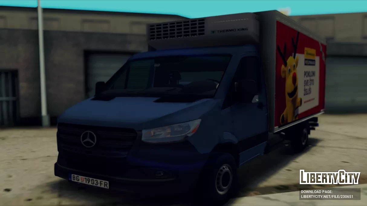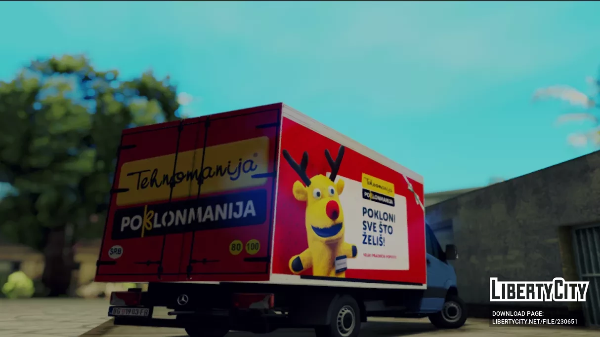 2019 Mercedes-Benz Sprinter Box — это современный фургон с кузовом-фургоном, используемый для коммерческих перевозок и доставки. Fвтомобиль украшен праздничной рекламой от сербской компании "Tehnomanija", что подчёркивает его использование для рекламных и промо-акций.
