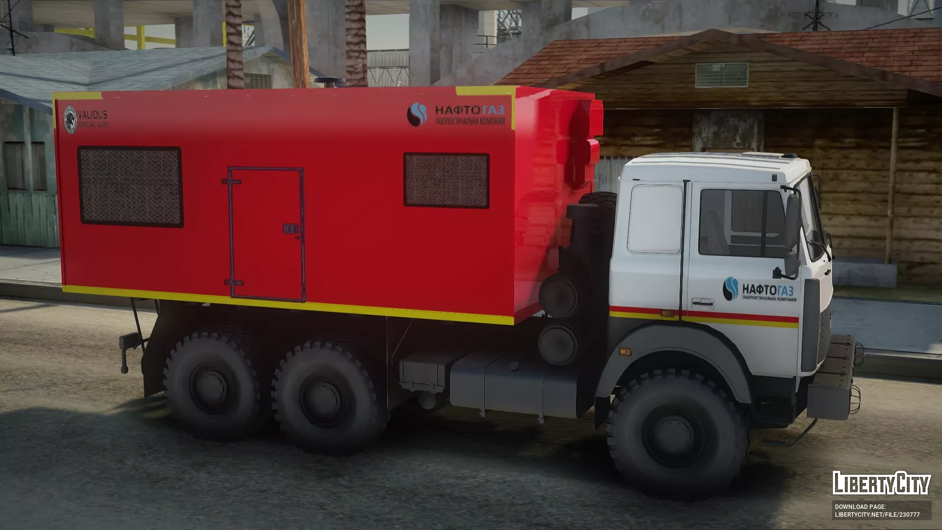 Этот МАЗ принадлежит компании "Нафтогаз" и используется для обслуживания и ремонта объектов газовой инфраструктуры. Ярко-красная надстройка позволяет перевозить специалистов и необходимое оборудование даже в труднодоступные районы.