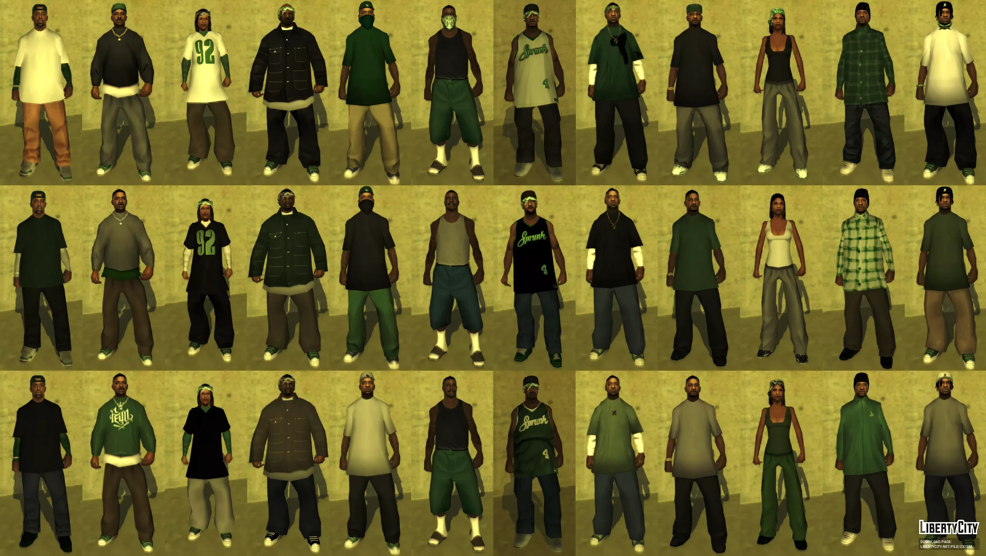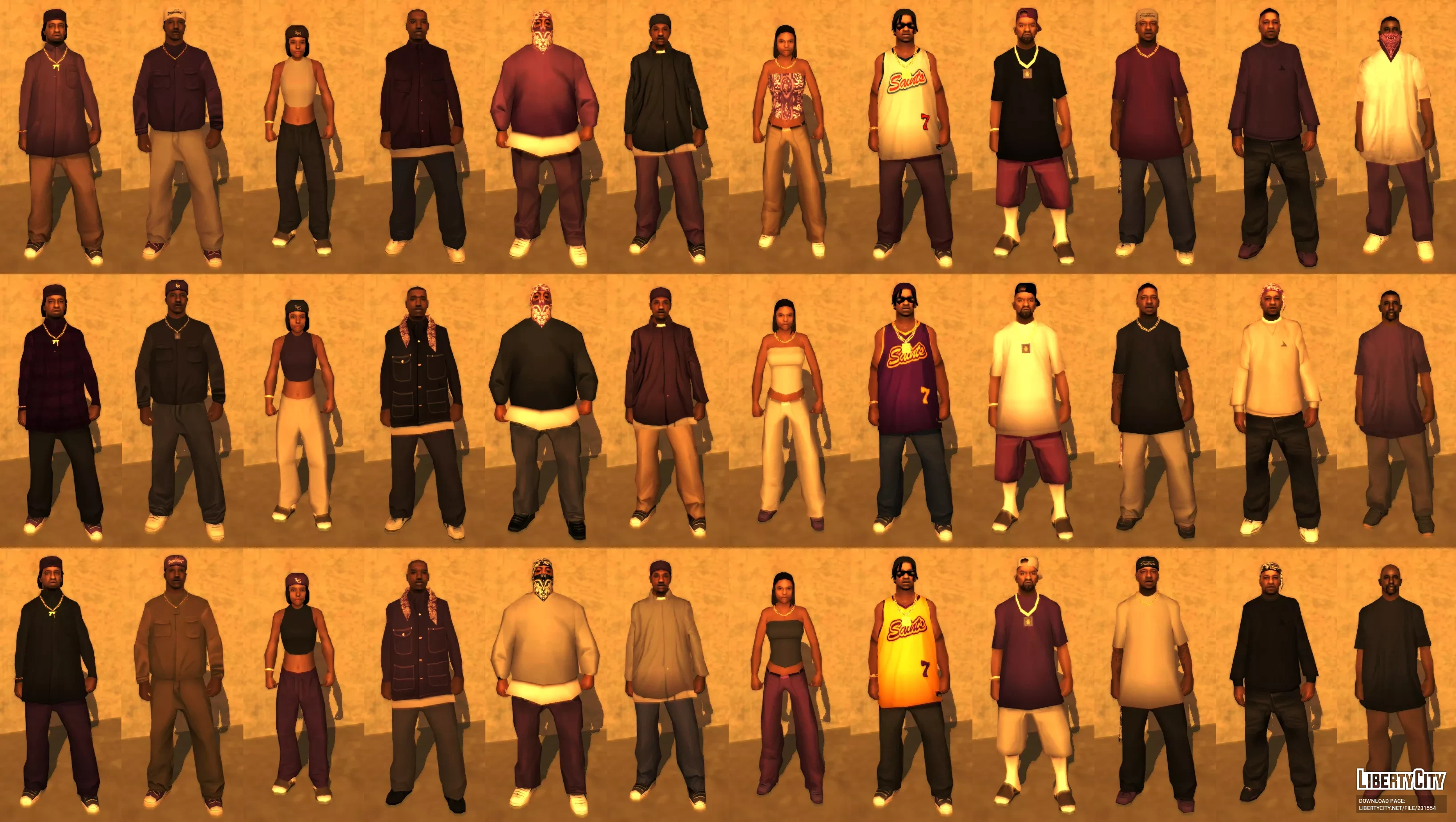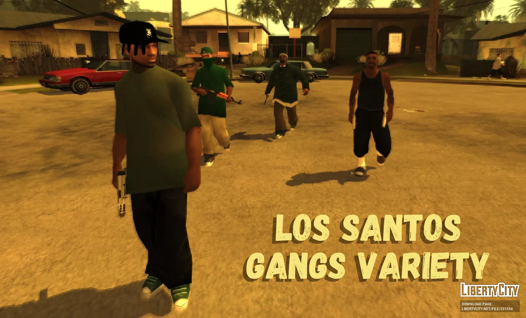 Этот мод пытается добавить больше разнообразия в банды Лос-Сантос, добавляя новых пэдов и перекраски одежды для семей, балласов, вагосов и азтеков. Некоторые из скинов могут появляться без цвета банды, возможно, только в черной одежде, что, на мой взгляд, добавляет реализма банд.