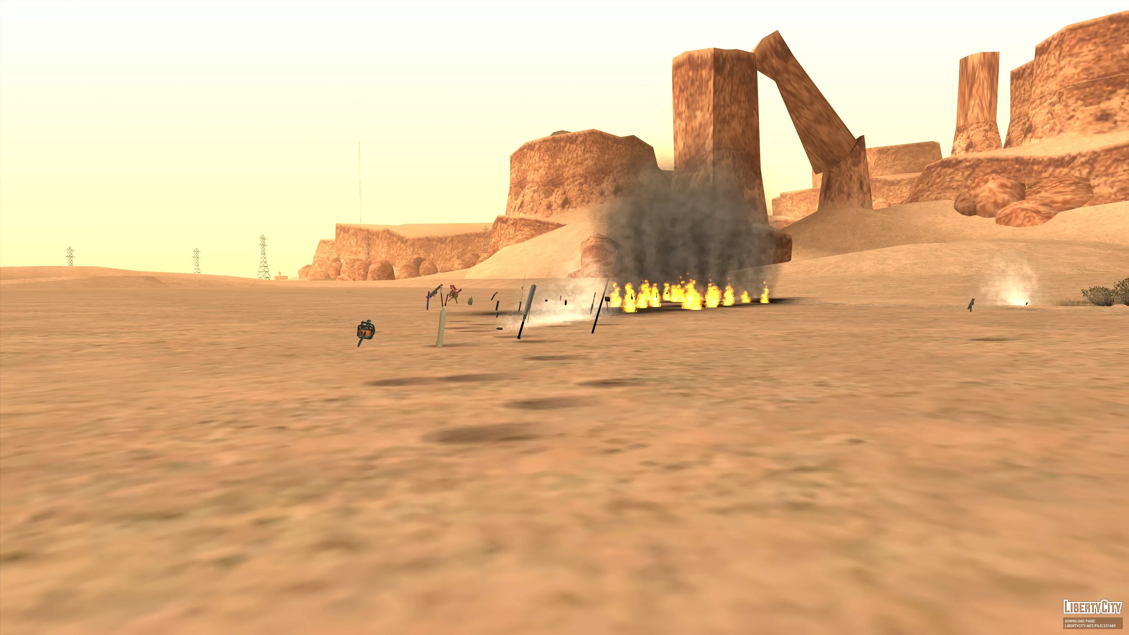 A group of ghostly weapons haunts the San Andreas desert, near the Restricted Area. Absolutely every weapon in the game is present. They appear at any time in various locations within the area, with the sole purpose of attacking CJ in a matter of seconds. Some weapons, like the camera, thermal goggles, and night vision, obviously cannot attack, but the rest can, including brass knuckles. It is highly recommended to have a mod that makes CJ immune, or he will be torn to pieces in less than a second.