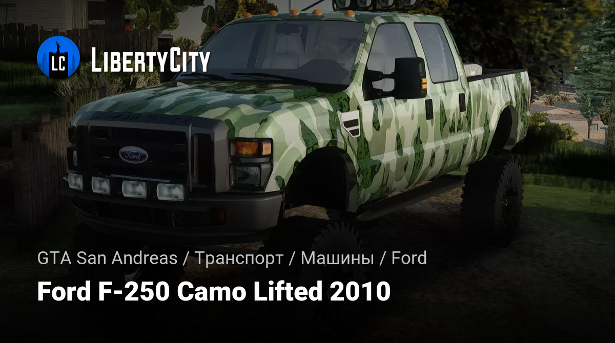 Ford F-250 Camo Lifted 2010 — это внедорожный пикап с лифтованной подвеской и камуфляжной окраской, созданный для экстремальных условий и активного отдыха. Он сочетает в себе мощность, проходимость и уникальный стиль, идеально подходя для охоты, рыбалки и приключений на природе.