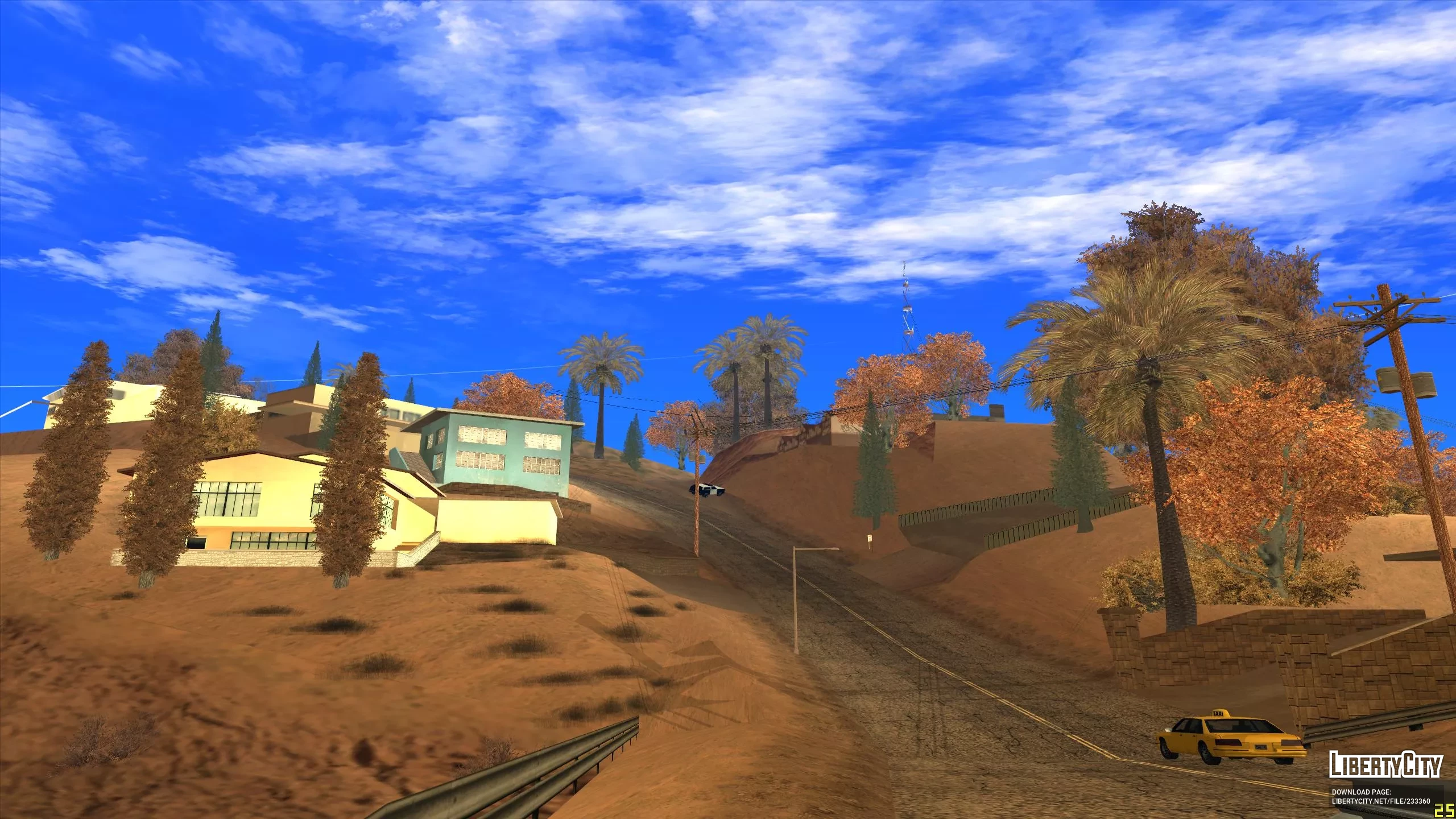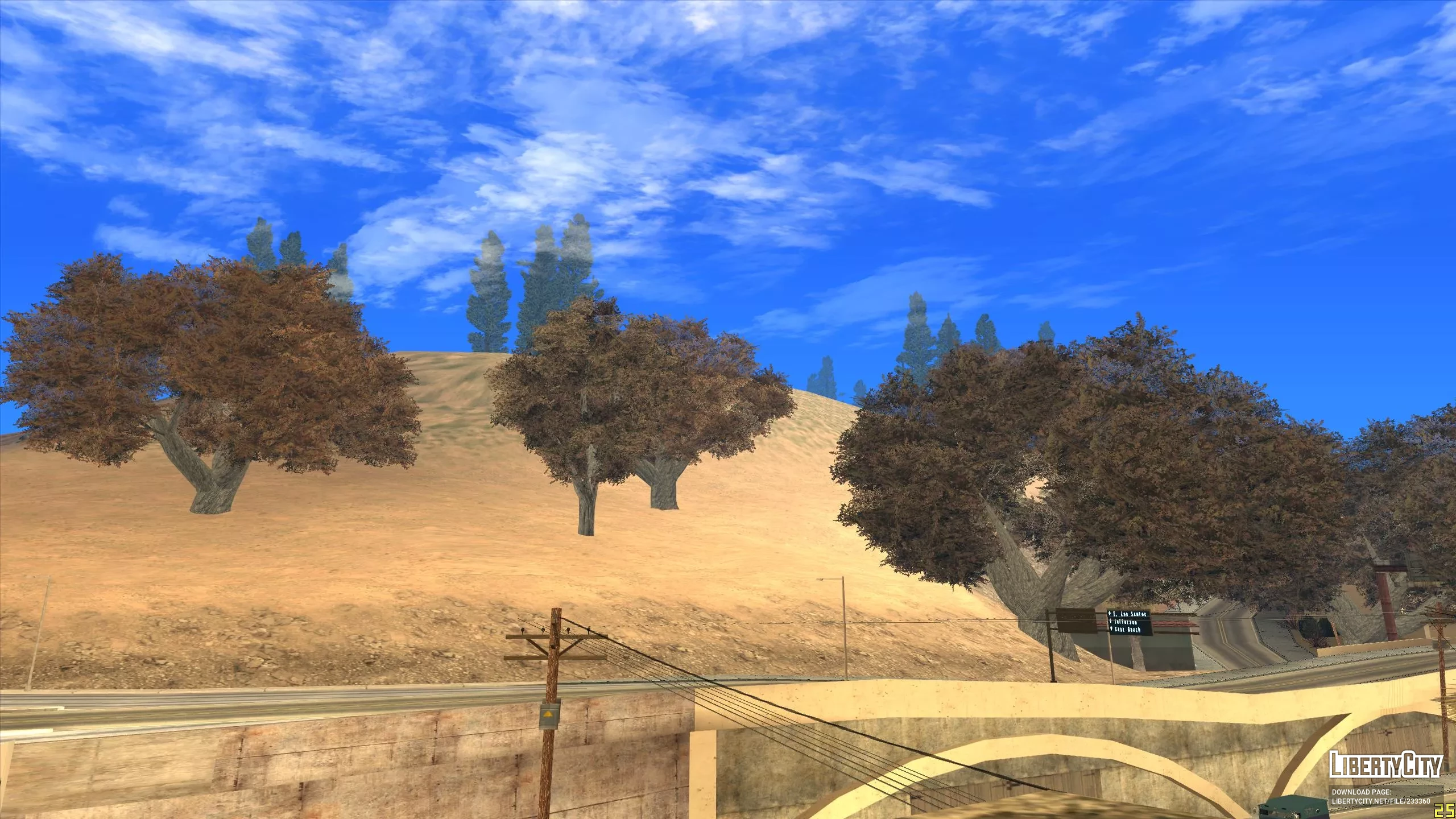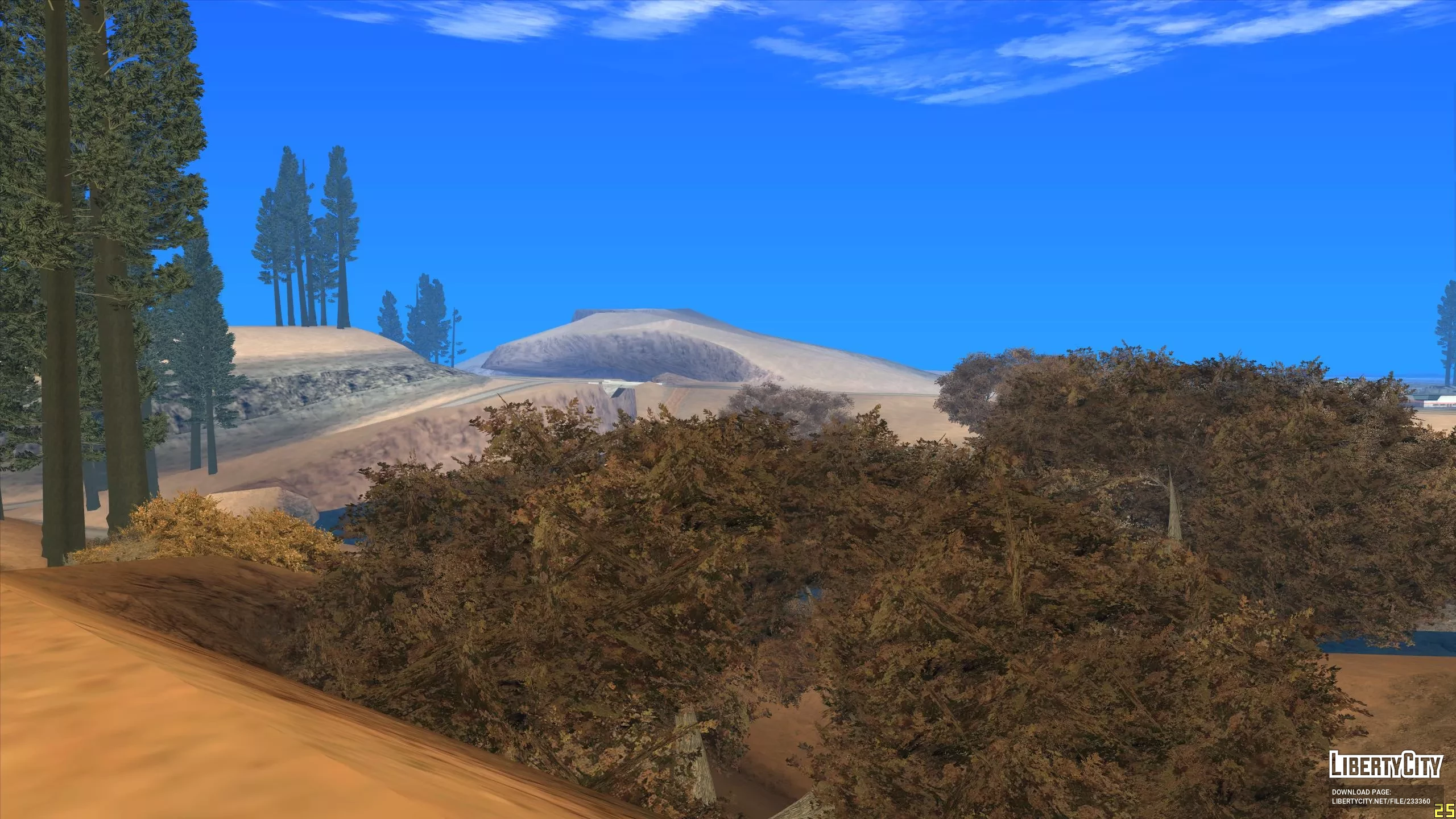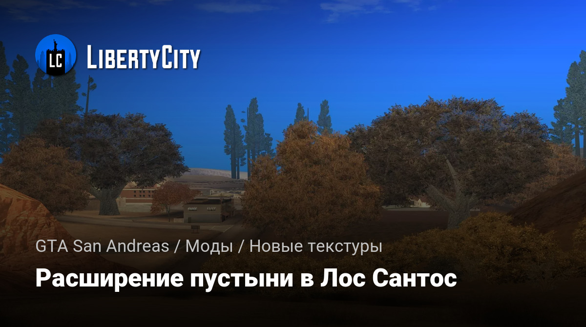 Этот мод расширит пустыню до Лос Сантоса и всех районов сельской местности. Если тебе надоели травяные покровы, то этот мод для тебя. Теперь все второстепенные дороги превратились в песочные, а скалистая порода в пустынные горы. Если этот мод совместить с модом на осенние деревья, то получиться не плохо. Текстуры не мерцают и не пропадают.
