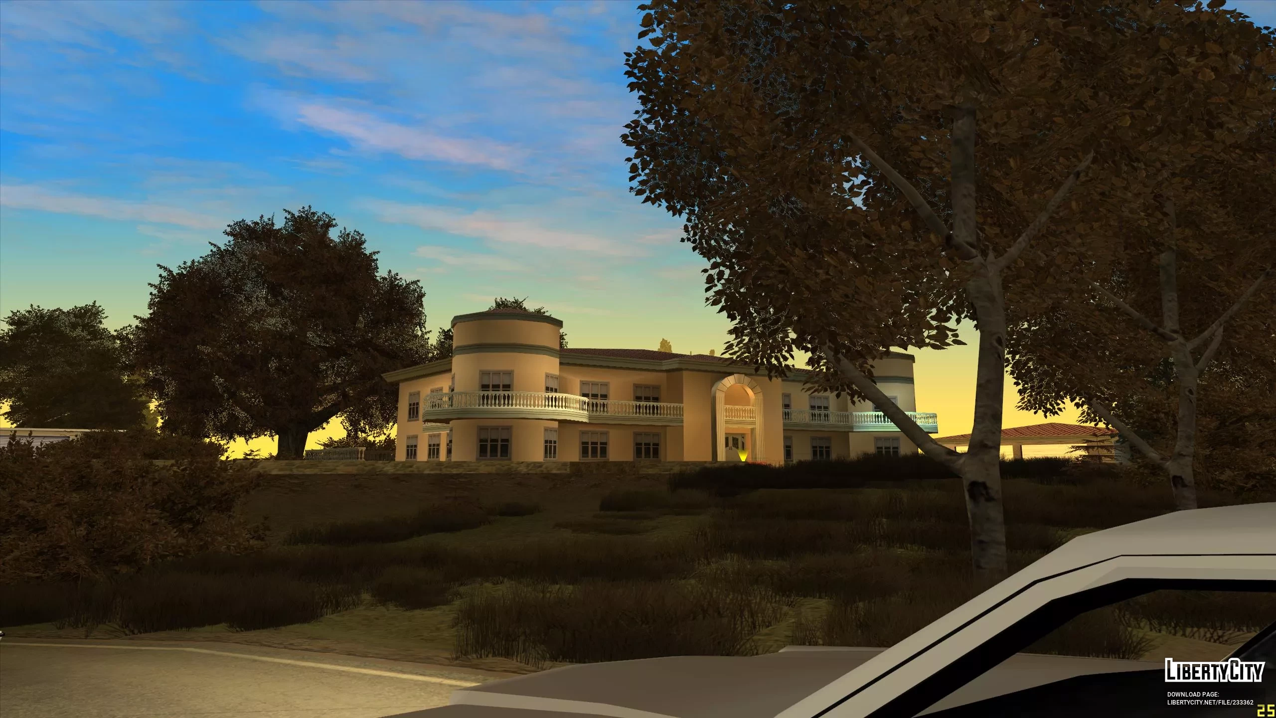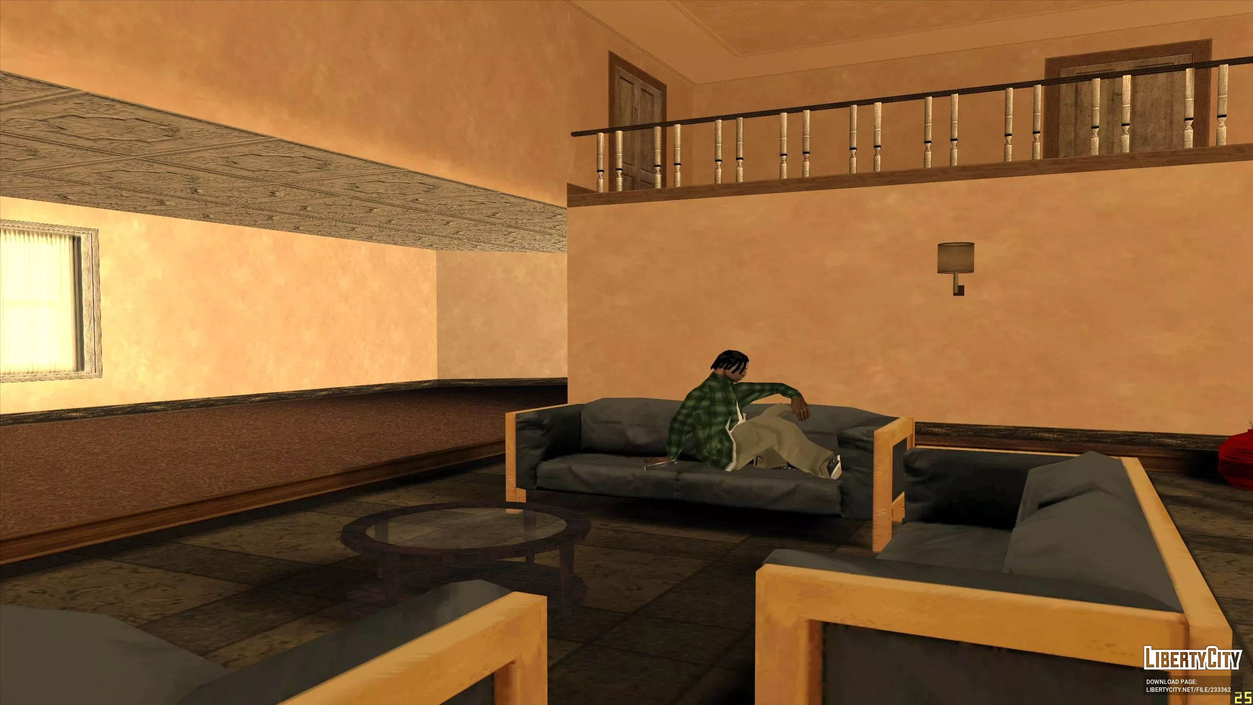 Этот мод подарит тебе еще одну недвижимость — особняк в Малхолланде. Теперь там можно сохраняться. У входа в особняк нанята охрана — двое сотрудников с оружием. Внутри царит приятная атмосфера: играет музыка, твои бойцы с района Grove отдыхают — один сидит на диване, двое других общаются. Также возле особняка будут появляться автомобили.