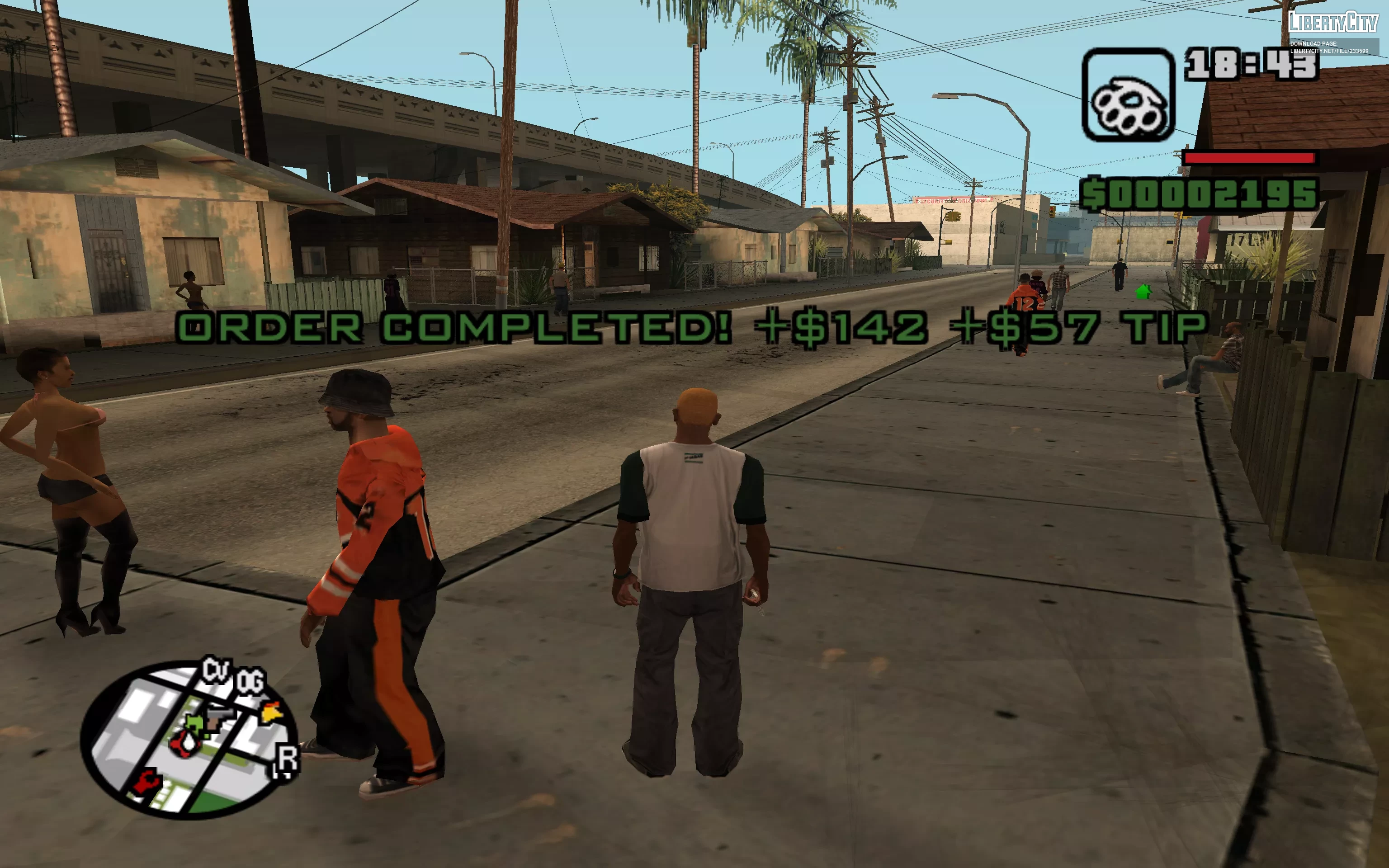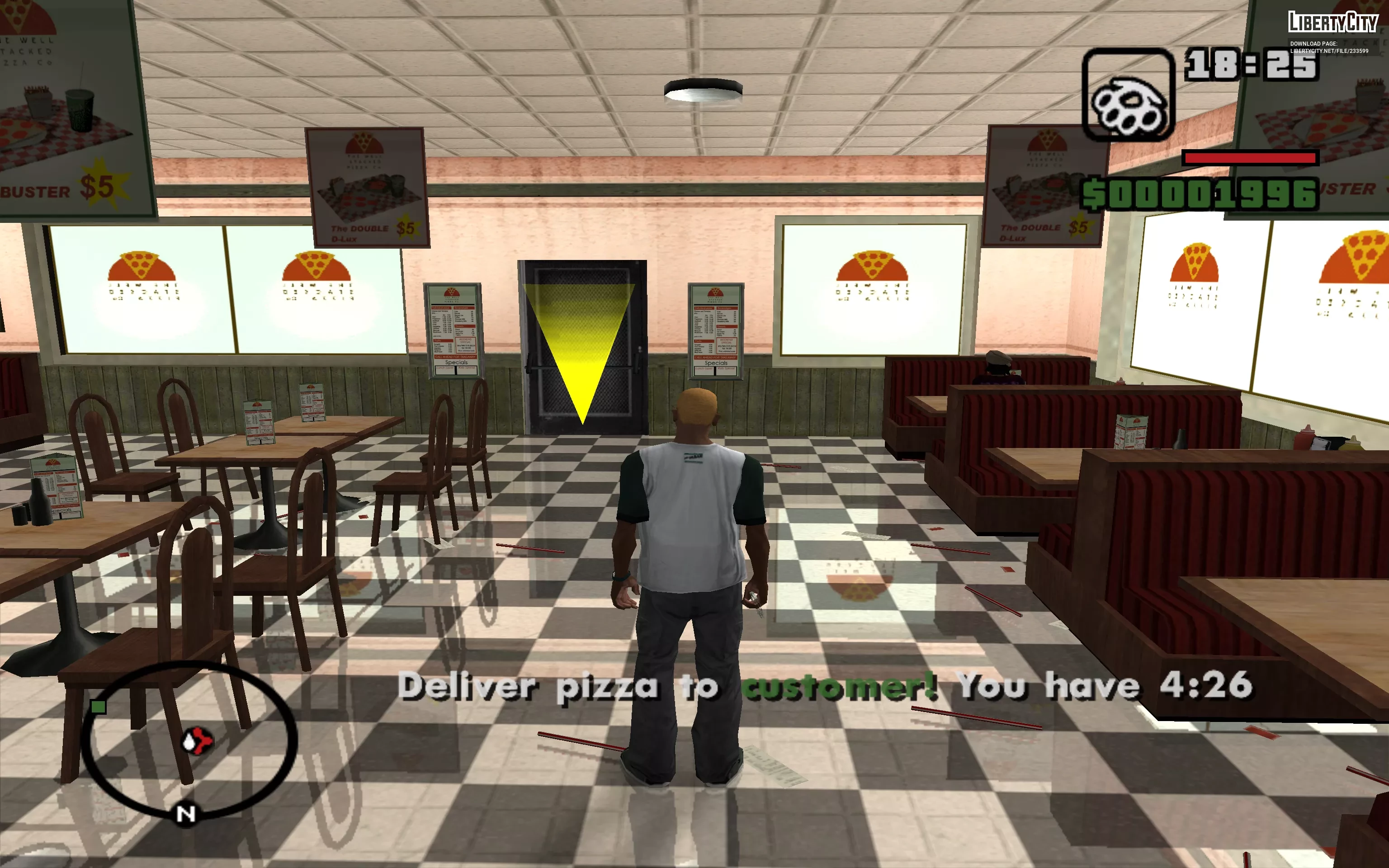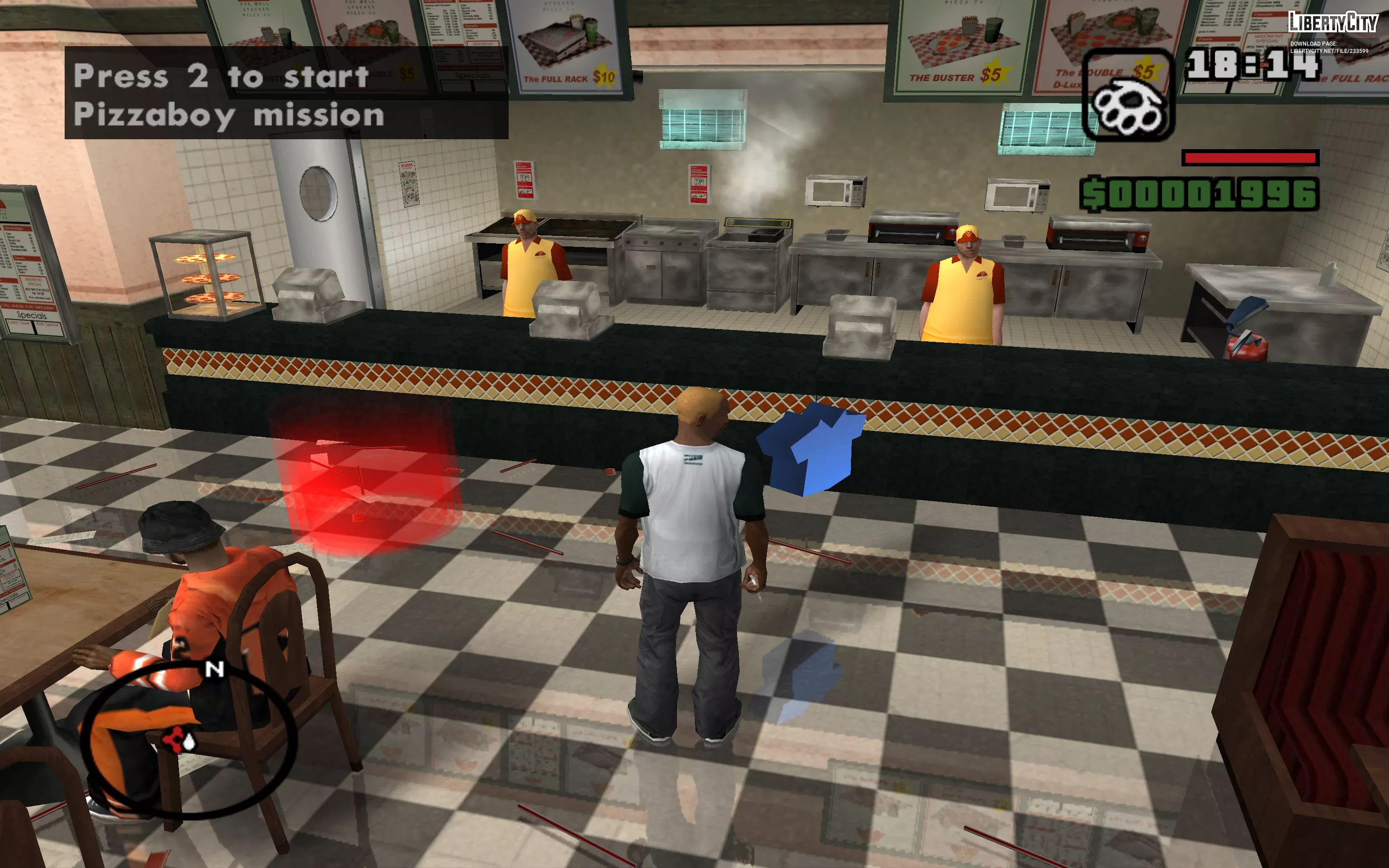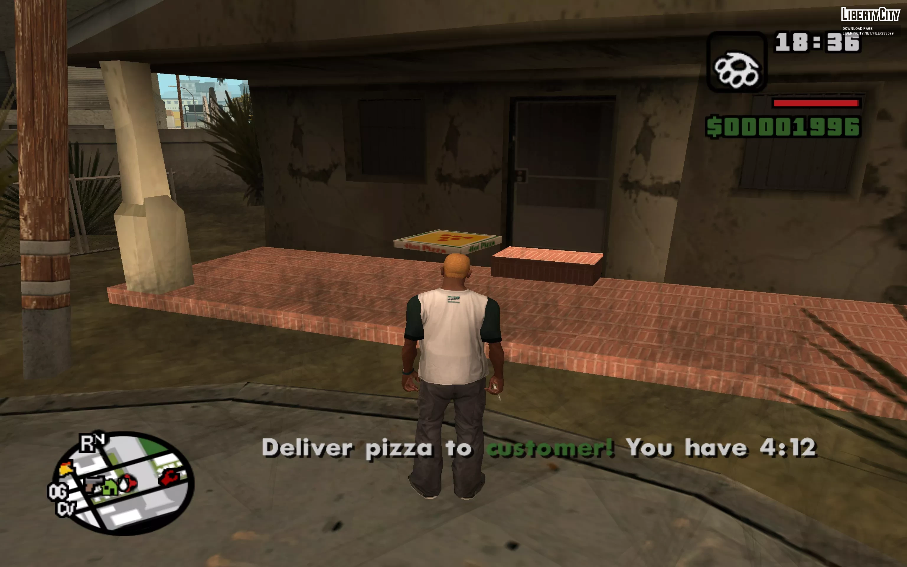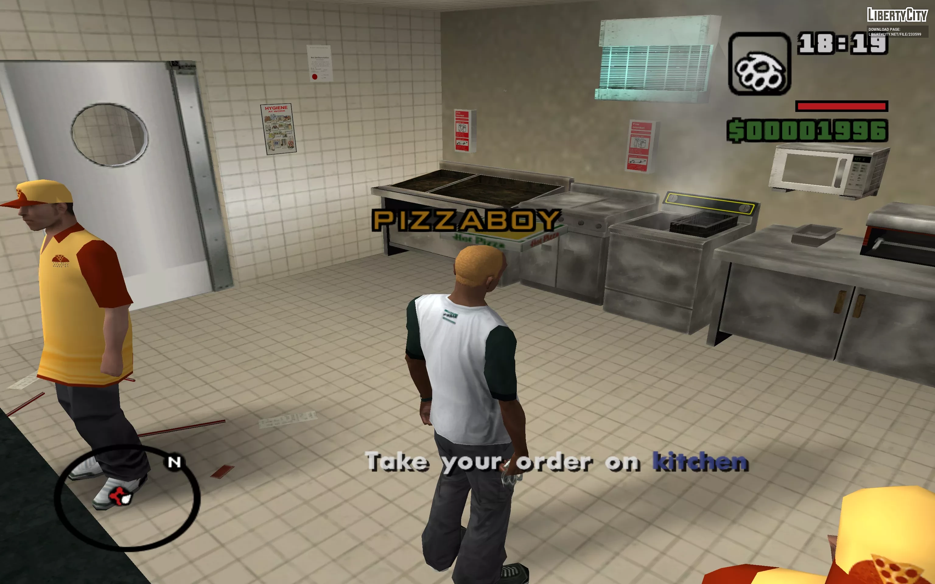 Мод добавляет в игру полноценную систему доставки пиццы в духе оригинальных побочных миссий. Начать работу можно нажав клавишу 2, находясь возле стойки в любой пиццерии штата. После начала миссии необходимо забрать заказ на кухне, и у вас будет 4.5 минуты на то, чтобы доставить его. Заказы разделены регионально, то есть вам не придется ехать из SF в LS или куда-то еще через всю карту. Всего 4 региона для работы: LS, SF, LV и RC (Red Country объяденяющий Блуберри, Монтгомери и Поломино Крик, доставка идет сразу между тремя деревнями так как они достаточно близко). После доставки заказа необходимо вернуться в пиццерию для получения нового. Предусмотрена система чаевых: чем быстрее был доставлен заказ, тем больше они будут. Если же не успеть за отведенное время, миссия будет отменена и с баланса будет списан штраф 150$ за опоздание. Также, штраф начисляется за утерю пиццы в случае ареста, попадания в воду и смерти. Доставлять заказы можно как угодно: пешком, на авто и любом другом ТС. Отменить миссию можно в любое время клавишей 2, как любую саб-миссию. За это штраф не начисляется. Мод максимально простой и сделан в ванильном SA стиле.