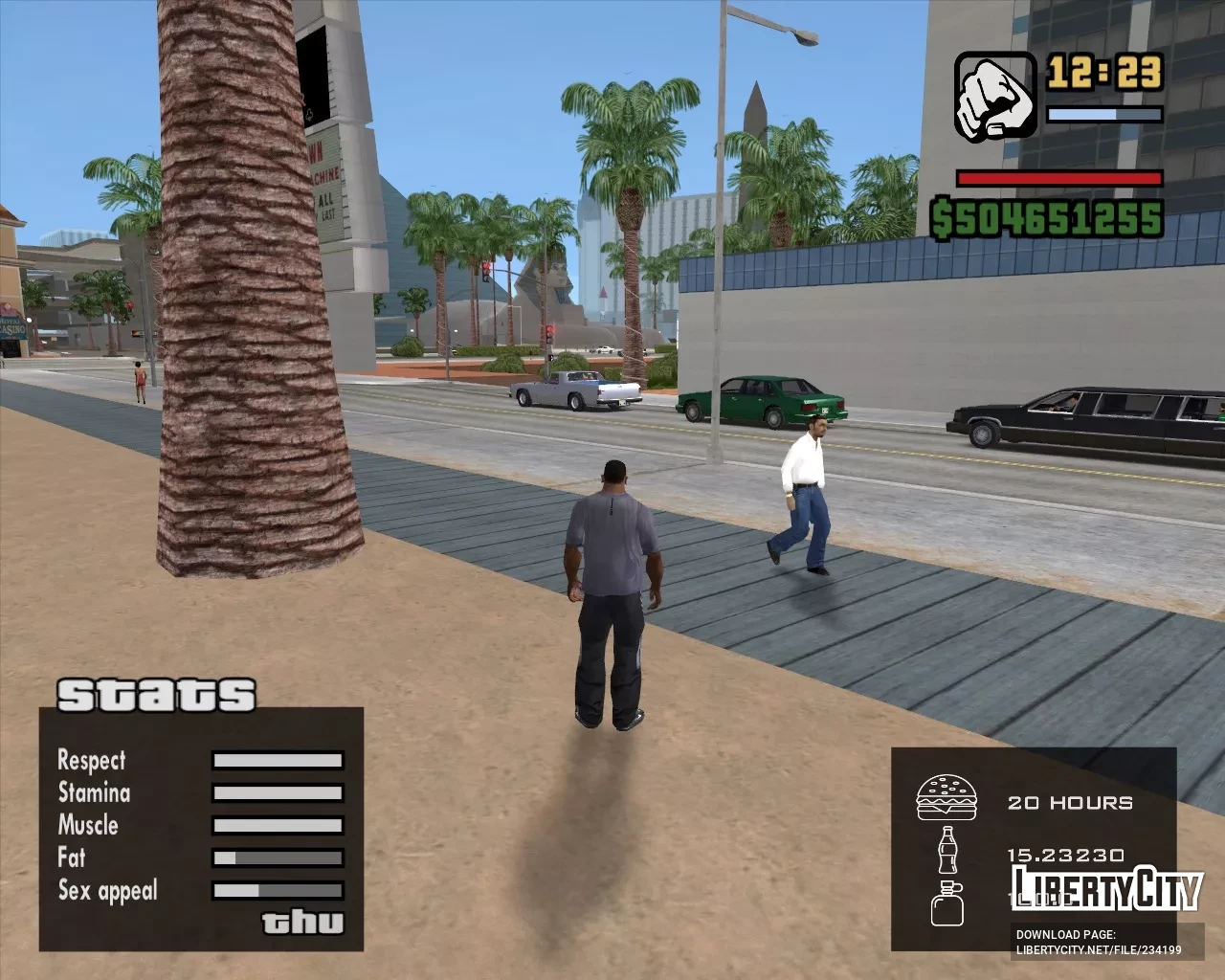 В добавок к этому жажда будет добавляться если СиДжей находится под открытым небом с 9.00 до 18.00 (только при ясной/солнечной погоде). Если что-то будет на СиДжеем — навес, козырёк, что угодно — прирост жажды остановится. И ко всему этому на жажду будет влиять нахождение в пустыне или Лас Вентурас. Жаркий регион всё-таки.