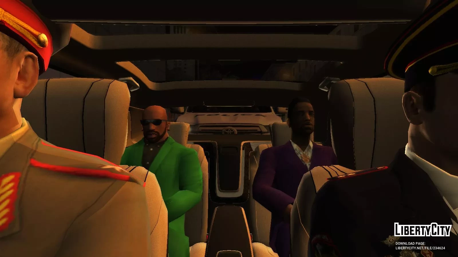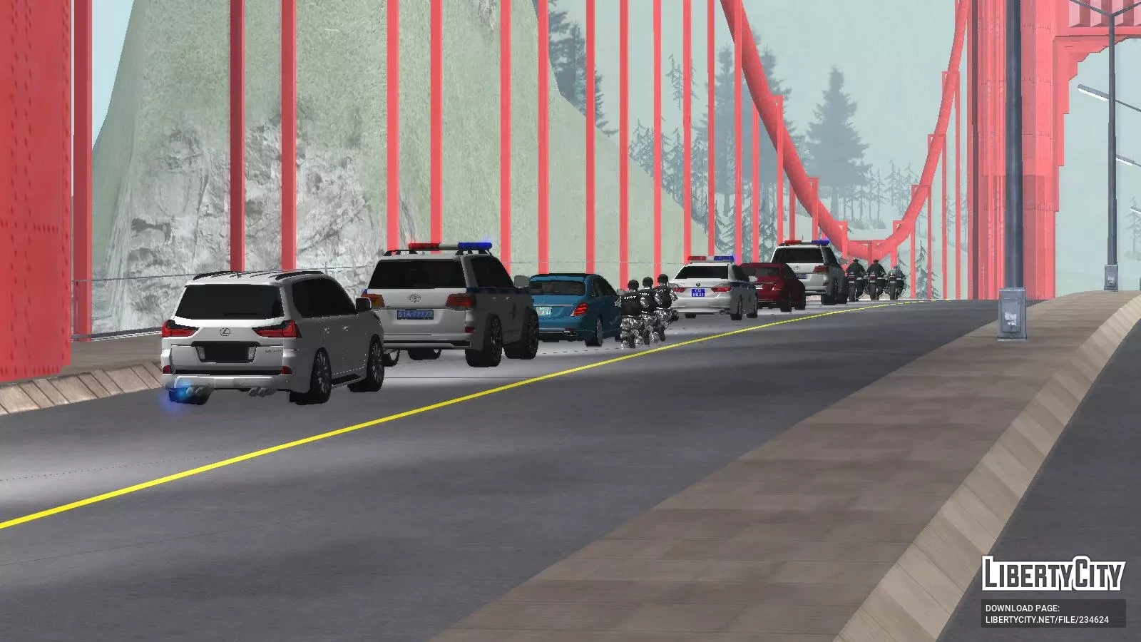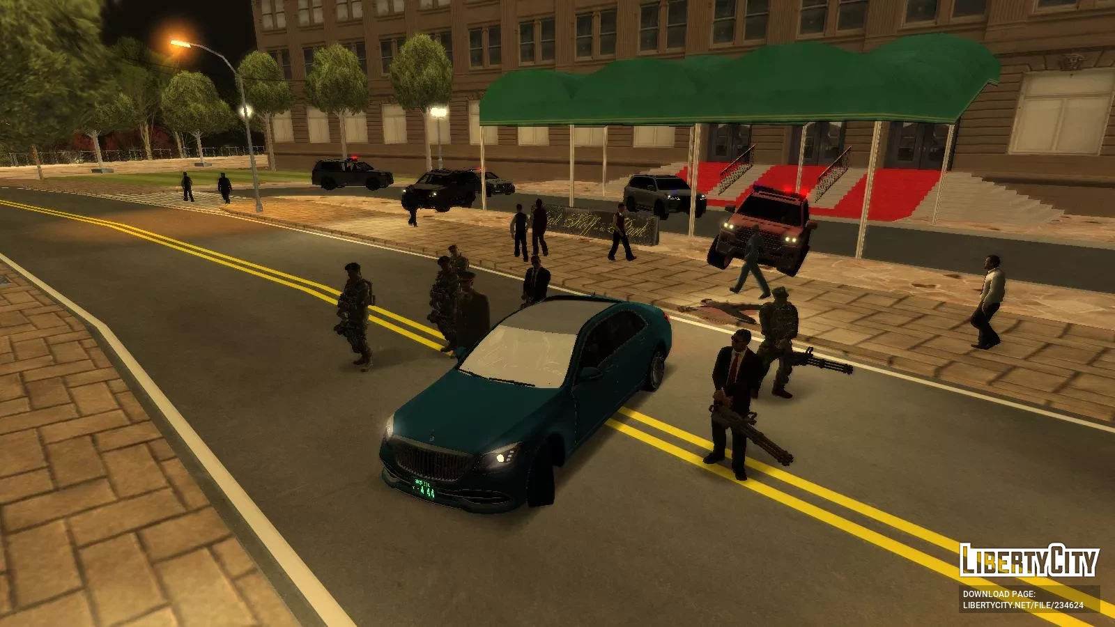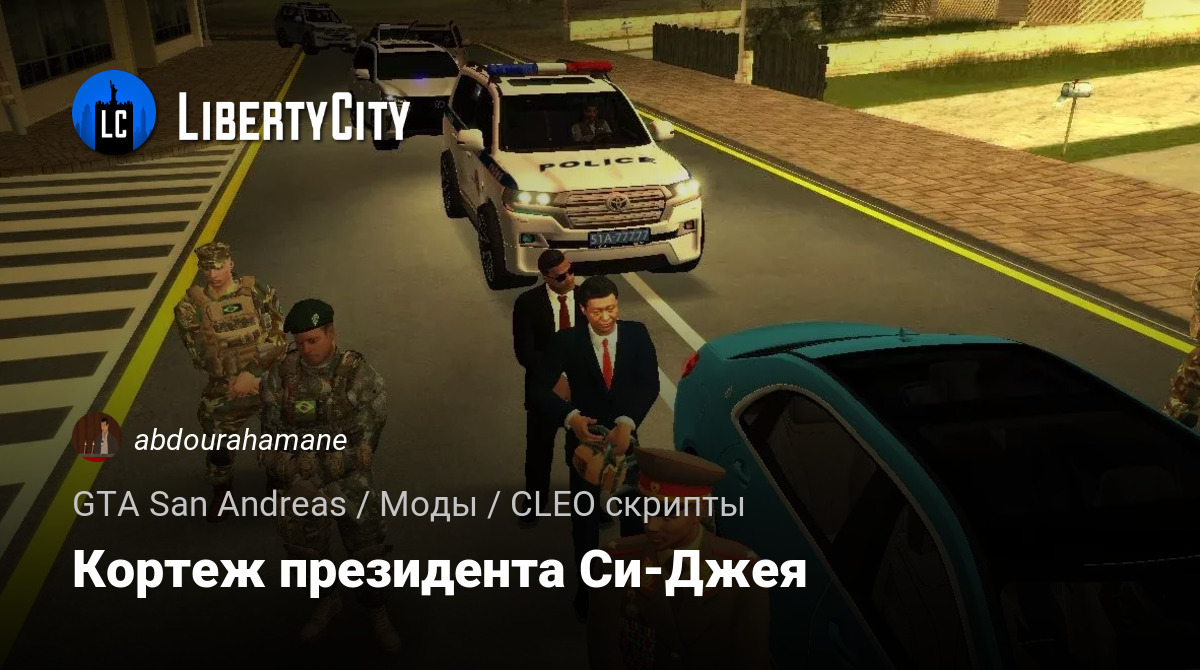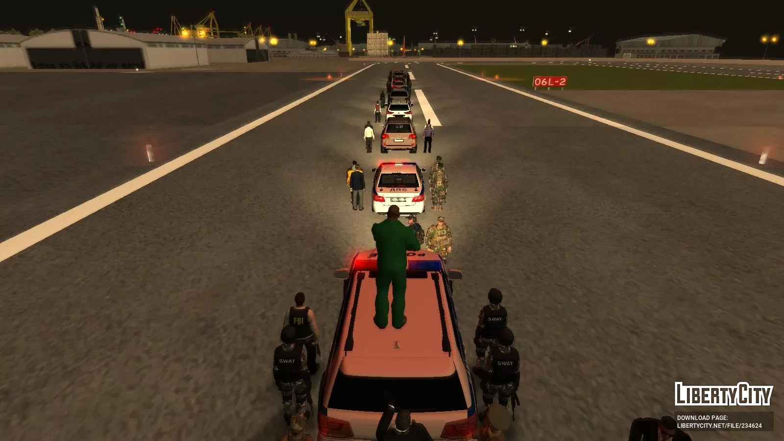 Этот мод добавляет в игру полноценный президентский кортеж для GTA San Andreas, состоящий из 9 автомобилей и 3 полицейских мотоциклов. Всего в сопровождении задействованы 32 телохранителя из различных подразделений, включая уникальных персонажей: Пуласки в роли командира президентской гвардии, 6 агентов службы ограниченной безопасности (SR), двух министров, двух журналистов, главу администрации президента, помощника президента Торино и даже Джизи — друга президента.