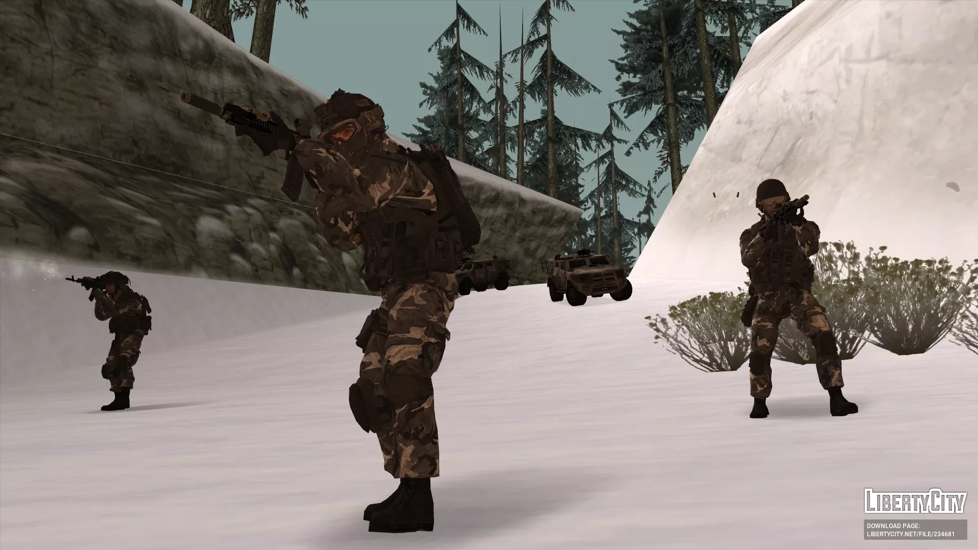Если использовать их с модом SkyGFX, то, возможно, даже не будут выделяться. Оружие и транспорт в комплект не входят, кроме Hk416, её я добавил как бонус.