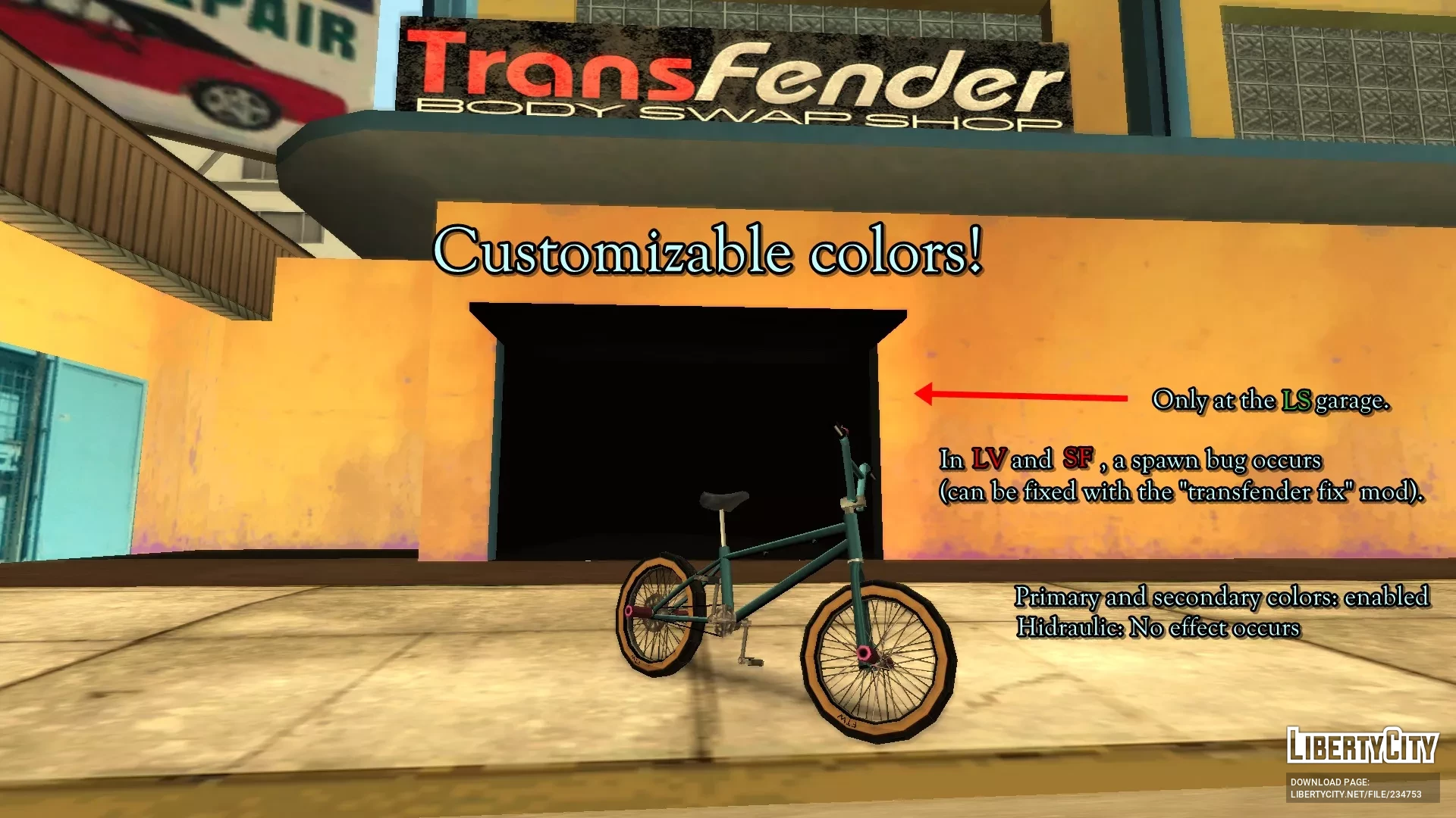 - Мод включает два типа BMX: один с металлическими подножками и другой с красящимися подножками. Звонок можно покрасить во всех версиях и он имеет 8 доступных цветовых палитр в дополнение к настраиваемым цветам в Transfender.
