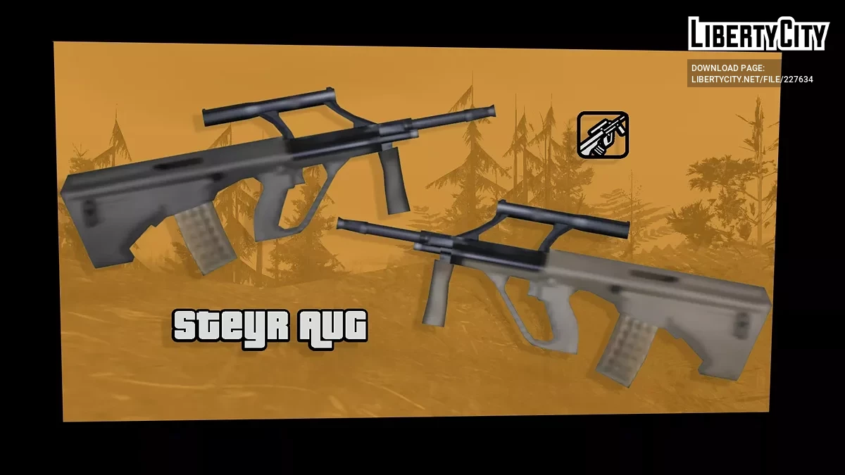 Порылся в файлах PS2 версии GTA Vice City и нашёл там Steyr Aug. Адаптировал его под GTA SA. ----------------------------------- Особенности: Оригинальная модель и текстуры Неплохо лежит в руках у CJ Пули летят из правильного места Своя иконка, кот...