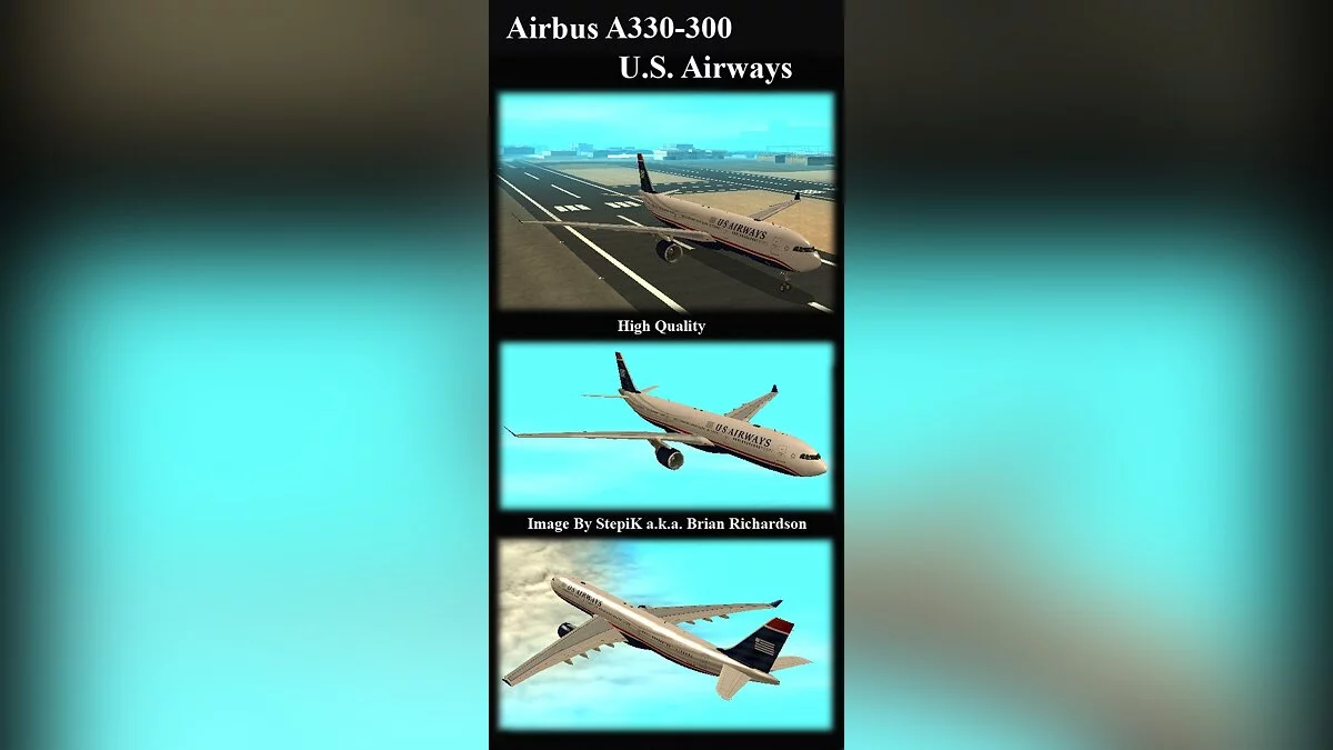 Коммерческий авиалайнер Airbus A330-300 авиакомпании U.S. Airways. Лайнер был сконвертирован из Flight Simulator X и поэтому лайнер высокого качества, присутствует салон и кабина, все детали тщательно проработаны. Приятных полётов! ...