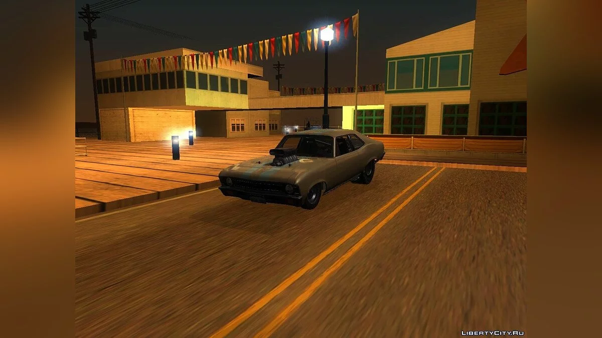 Chevy Nova для драг-рэйсинга. В архиве 2 версии: CLEO и обычная. В CLEO версии можно встать на задние колёса нажатием кнопки"Вниз".