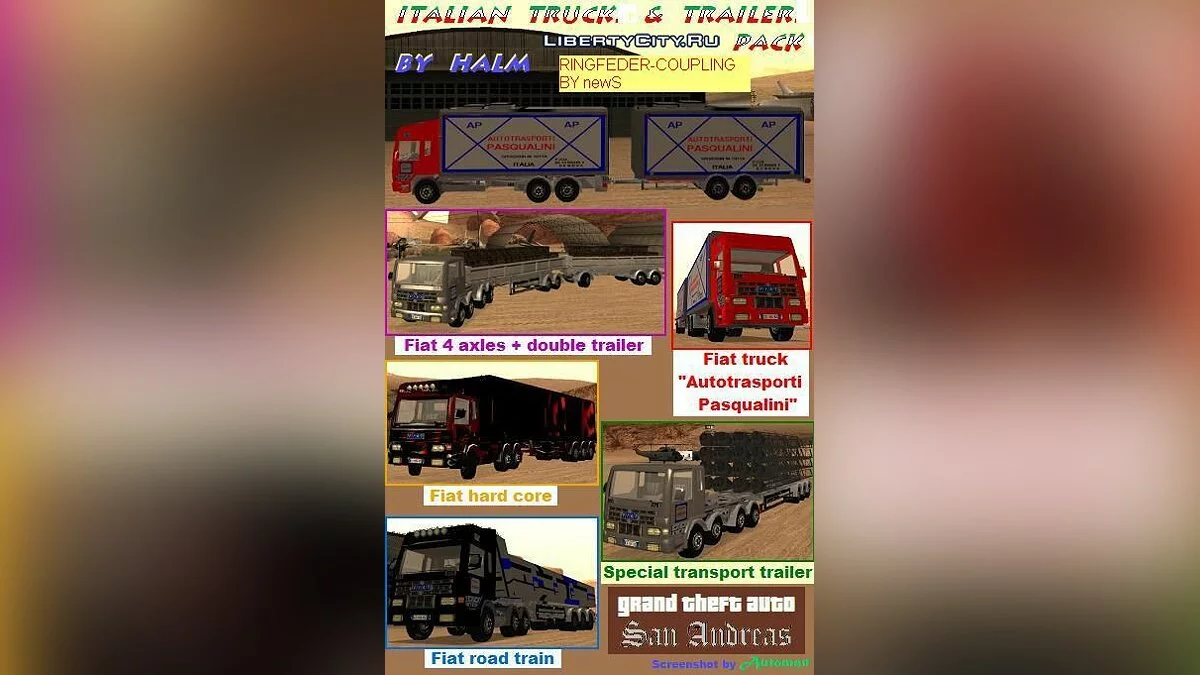 Truck Pack для GTA San Andreas. Пак измененный грузовиков от nyolc8 В пак входят: - Обновленный Dumper. - Обновленный Cement. - Обновленный Linerunner. - Обновленный Tanker. - Обновленный RDTrain. - Обновленный Artict1 (Прицеп-рефрижератор). - Обно...