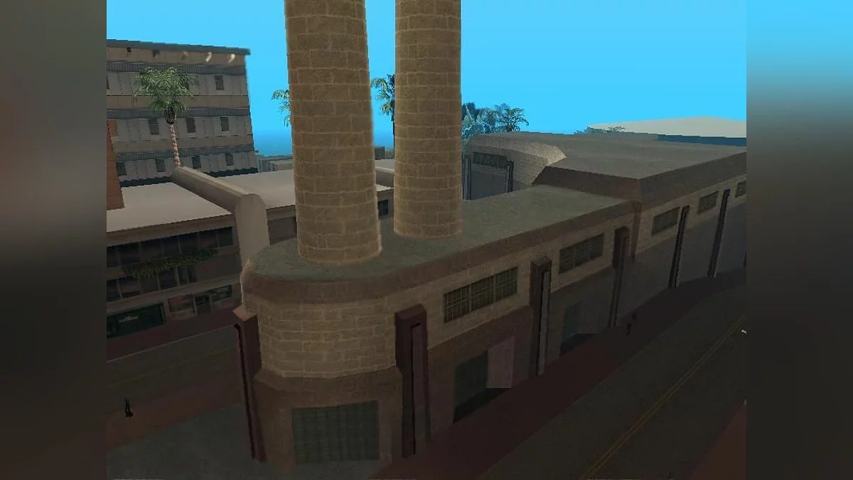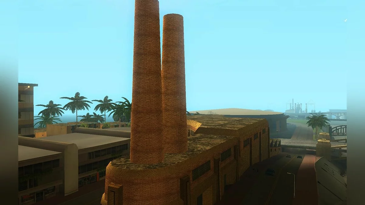 Данный скрипт добавляет в Сан Фиерро (Во второй город), в район Easter Bay Airport, недалеко от железнодорожного вокзала и автошколы, на завод дым, который идёт из труб. Да, скрипт один из наилегчайших, но согласитесь, реалистично ведь.) Завод, трубы...
