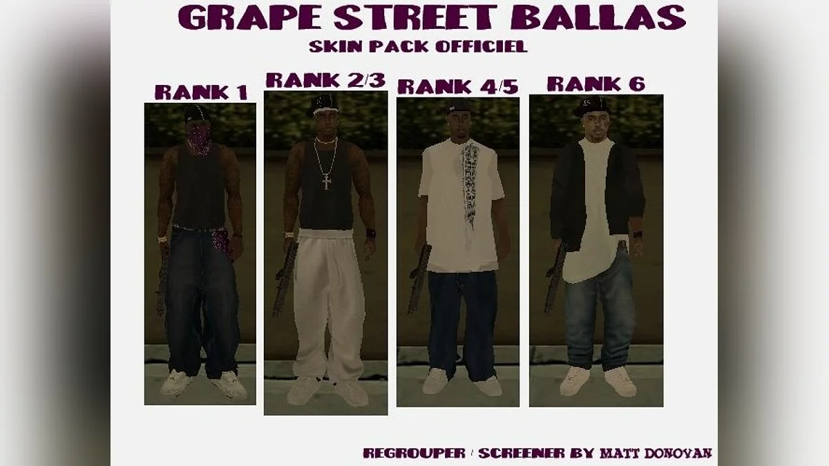 Веселитесь с балласами вместо грува!Зелёная одежда заменена на пурпурный!Свит,Смоук,Райдер и Кендл тоже в пурпурном!Установка в архиве Readme(ENG)....