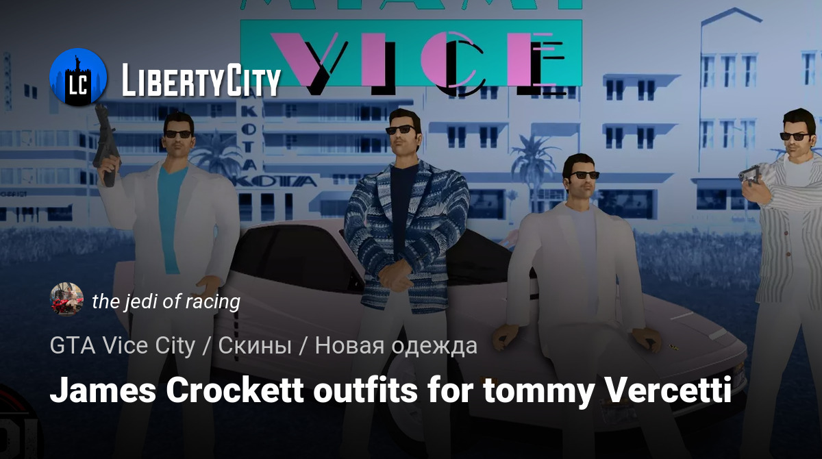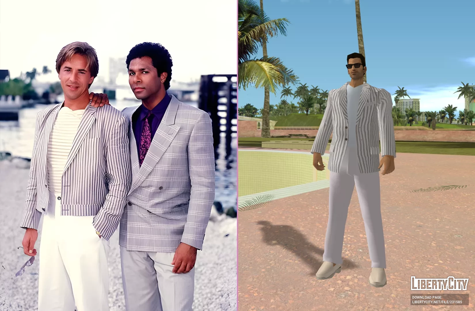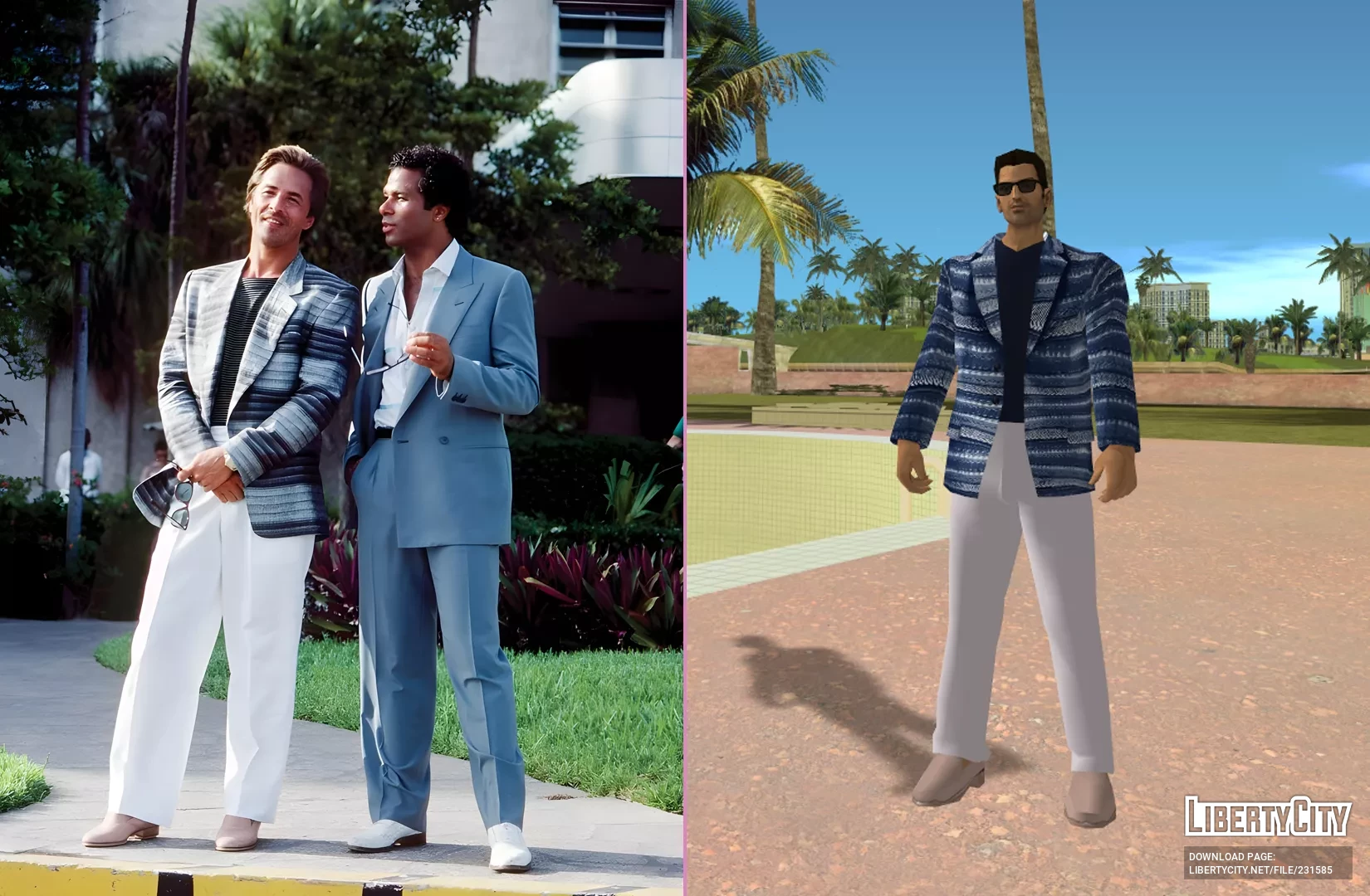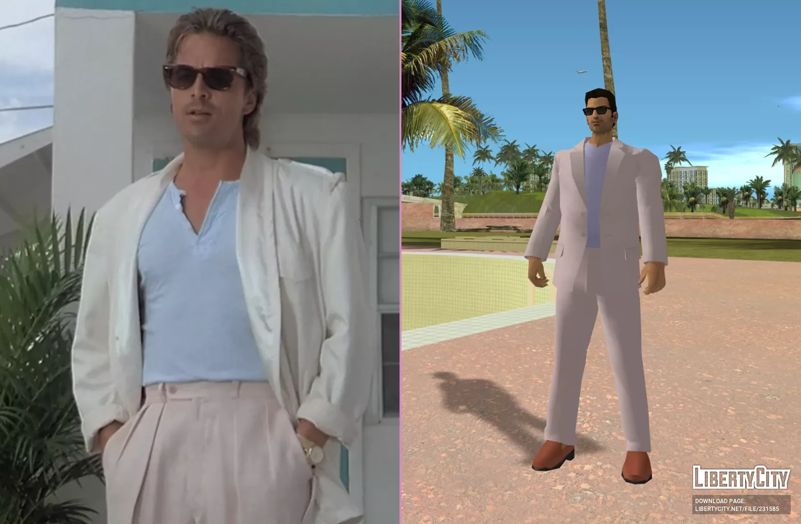 Hello everyone! I present to you my James Crockett outfit pack for Vice City — four classic looks straight from Miami Vice, recreated with the show’s original style and colors.