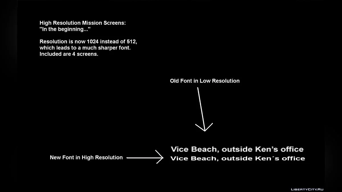 Маленькая, но очень приятная модификация, которая заменяет оригинальный шрифт на HQ в некоторых роликах. Речь идёт о тех, которые нам показывают в начале игры. Установка: 1. Скачать архив; 2. Распаковать; 3. Файлы intro1.txd, int...