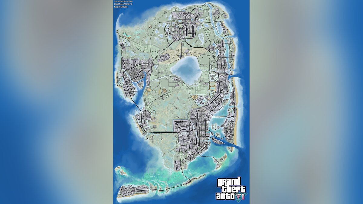 Предварительная карта Grand Theft Auto 6, собранная пользователями сети, представляет собой остров, омываемый сине-зелёными водами, с разнообразным ландшафтом и многочисленными городскими районами. В центральной его части находится крупный город с плотной застройкой, напоминающей атмосферу Вайс-Сити, включающей высотные здания, переплетённые сетью дорог и мостов. На востоке и западе город переходит в прибрежные районы с более низкой застройкой.