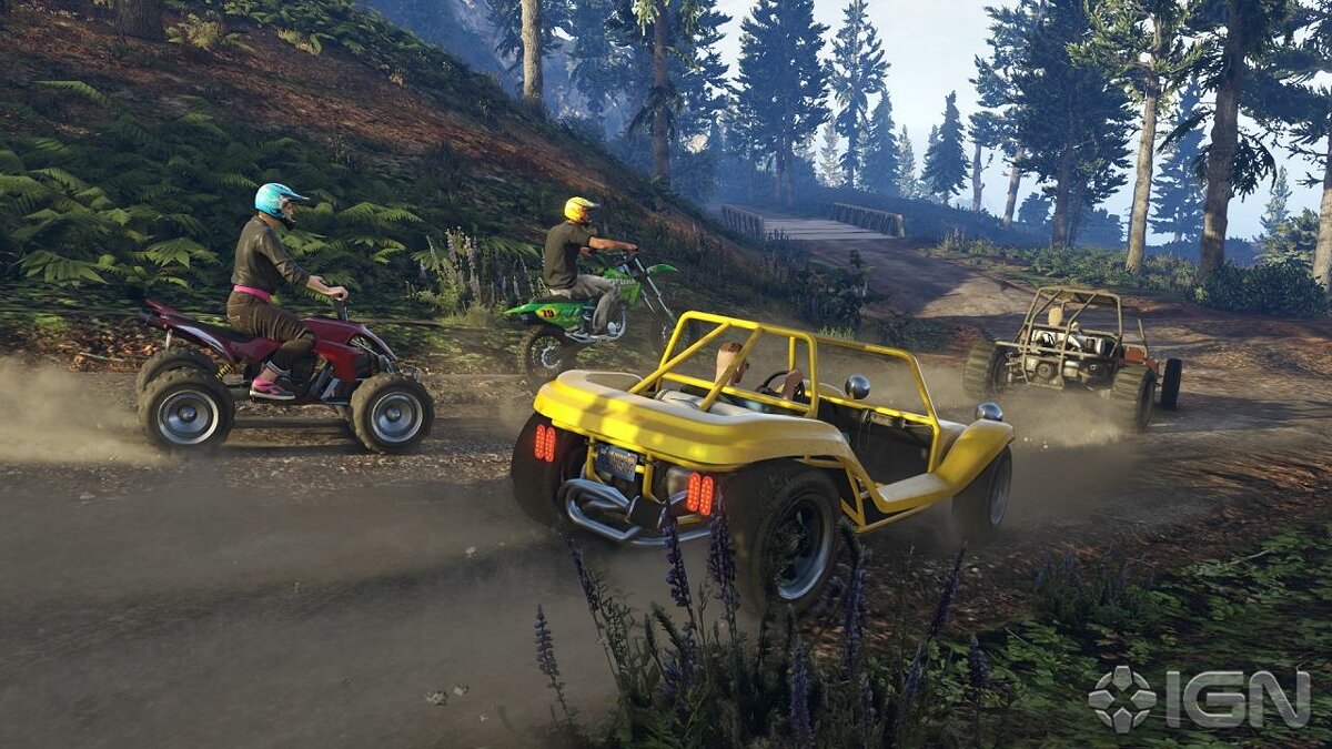 Взять, к примеру, "Гонку по Сэнди Шорс" в Блэйн Кантри с участием 30 игроков. Ехать можно было только на Санчезе, а хост залочил игру на вид от первого лица (а еще хост может заставить играть только с видом от третьего лица или оставить право выбора за игроками). Через мой шлем и очки (в каждом транспортном средстве, которое при езде требует наличие шлема, присутствует свой собственный вид от первого лица, а самый крутой, пожалуй, в вертолете Buzzard) я видел около дюжины мотоциклистов прямо перед собой. Как только мы тронулись с места, грязь из-под их колес полетела прямо мне в лицо. Я наслаждался гонкой на высоких скоростях с прекрасным видом (спасибо серии Forza Motorsport, которая подготовила меня к этому моменту), когда ТРАХ! — сзади в меня врезался один из тестеров Rockstar, который решил победить в этой гонке, чертов спортсмен. В конце концов, это же GTA...