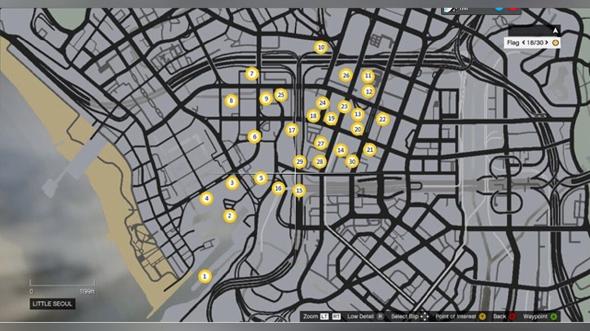 Чтобы получить золото в этом испытании, рефлексов будет недостаточно — нужно думать! Подумайте, как быстрее собрать все флаги и спланируйте свой маршрут заранее. Для начала соберите те, что находятся на западе города — они легче всего. Затем следуйте в город и собирайте флаги вокруг небоскребов, в порядке их высоты, чтобы собрать их все. Когда нужно облететь здание, то выпускайте шасси — это сбросит вашу скорость и повысит маневренность. Скорость не так важна, как вам кажется, поэтому собирайте флаги медленно, но верно. Наконец, не бойтесь неудач, ведь ошибки помогут вам выработать лучший маршрут. Предпочтительнее всего собирать флаги в том порядке, как указано на этой карте: