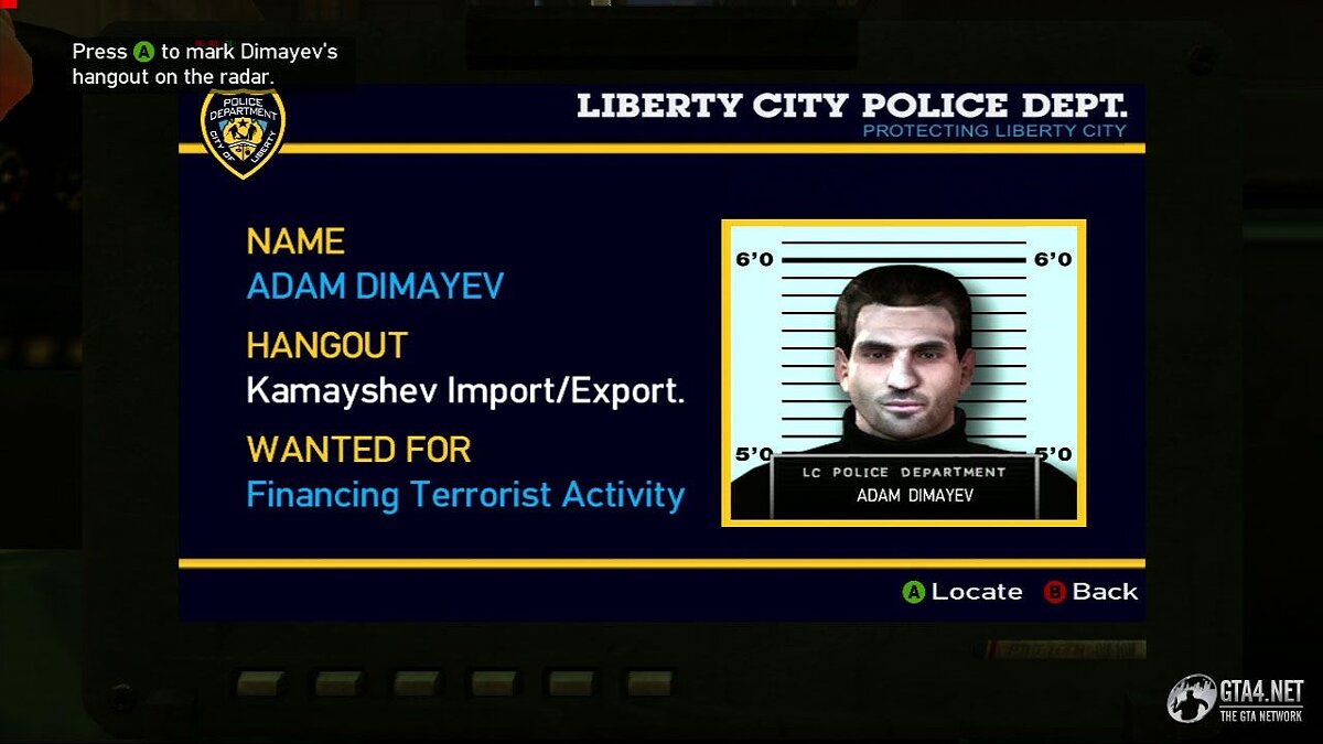 Найдите полицейскую машину и войдите в компьютер. Самый простой способ найти машину — позвонить 911 с сотового и украсть машину у приехавших копов. Затем избавиться от уровня розыска и машина в вашем распоряжении. Остановитесь и войдите в полицейский компьютер, далее нажимайте Search Police Records, а затем Search by Photo и загрузите фотографию, которую вам прислал работодатель. Цель зовут Адам Димаев и он разыскивается за содействие террористам. Отметьте его на радаре и поезжайте к нему.