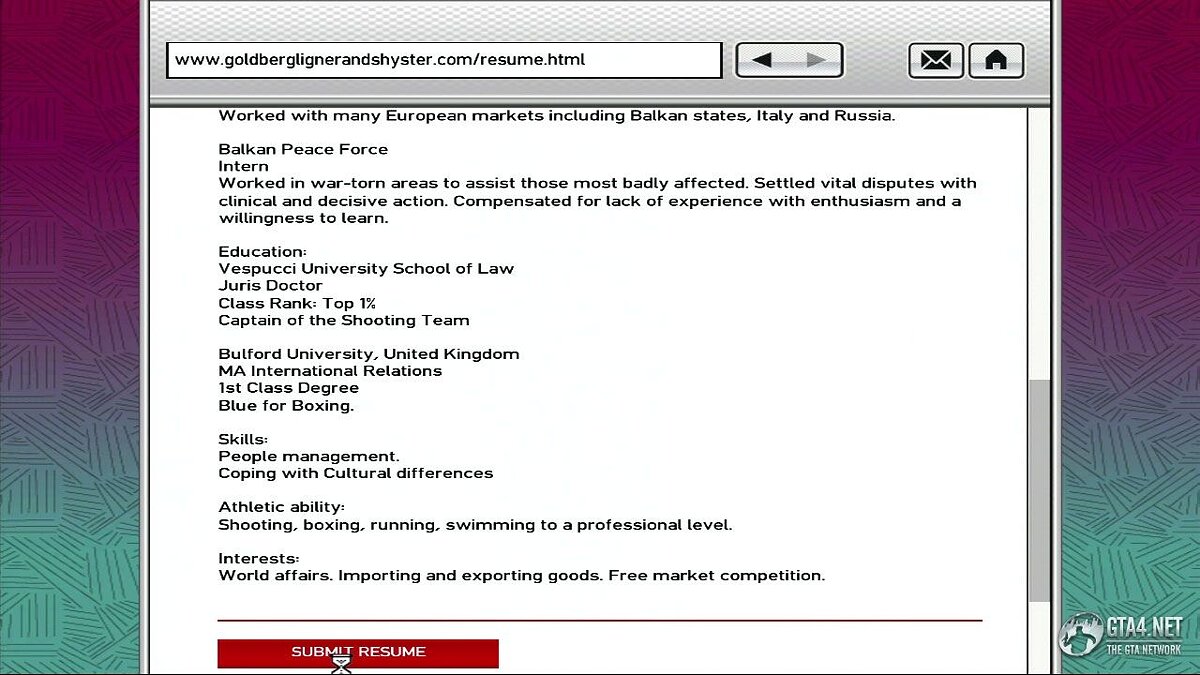 Садитесь за компьютер и щелкайте на рекламу Goldberg, Ligner & Shyster, чтобы попасть на этот сайт. Идите в раздел Careers и отправьте свое резюме. После того, как вы выйдите из кафе, Нико позвонит Францису и скажет, что резюме отправлено. Теперь вам нужно ждать звонка от этих GLS. Убить время можно занявшись прохождением других миссий, или просто покататься по городу. А можно просто пойти и проспать шесть часов у себя дома.