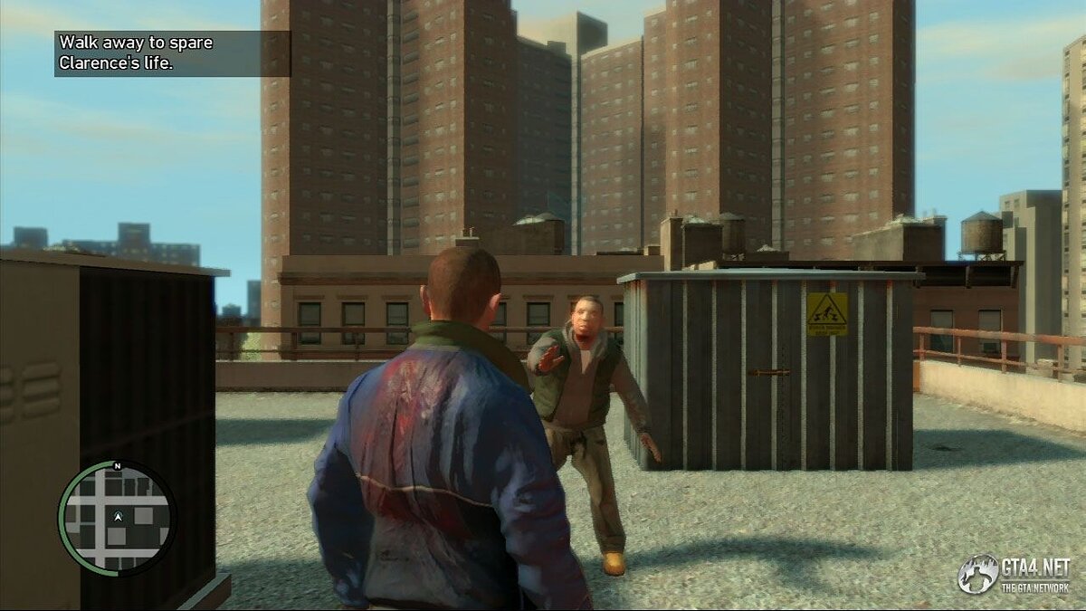 Если вы все-таки решили сохранить жизнь Кларенцу или же решили убить его более тяжким способом, то на крыше вы заработаете две звезды розыска, и все здание будет окружено полицией. Большинство копов расположится в западной половине комплекса, поэтому идите в восточном направлении и спуститесь там вниз по лестнице. Внизу поверните налево, а потом снова налево. Убегайте через ворота, затем найдите машину и оторвитесь от копов. Если вам повезет, то вы сможете уйти из здания, не встретившись ни с одним копом.