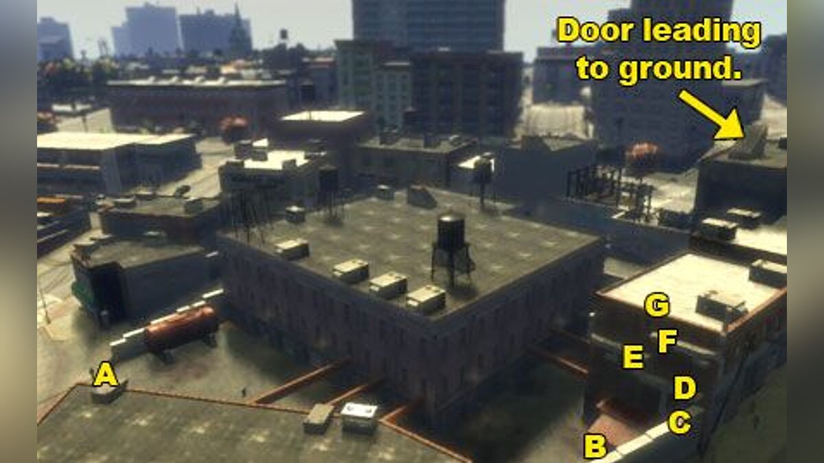 Склад, внутри которого стоят грузовики с кокаином, находится на Mueri Street. Территория хорошо охраняется русскими. Сначала вам нужно найти способ проникнуть на эту территорию, поэтому перелазьте через металлическую решетку, но не через главный вход. Используйте решетку, которая правее (А). Пройдите вперед и заберитесь на синий контейнер (B). Затем заберитесь на стену (C) и используйте вентиляционные шахты (D-F), чтобы забраться на крышу (G).
