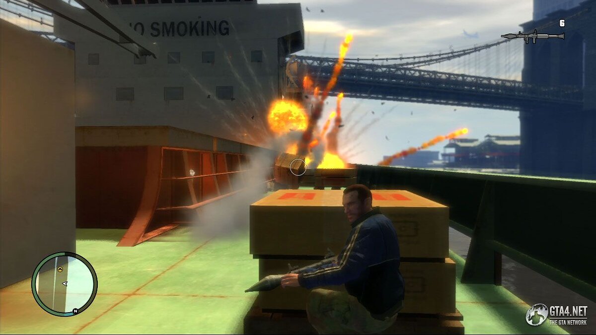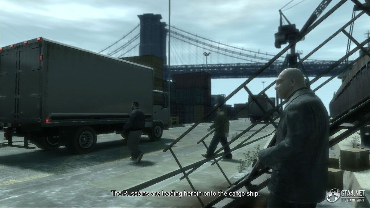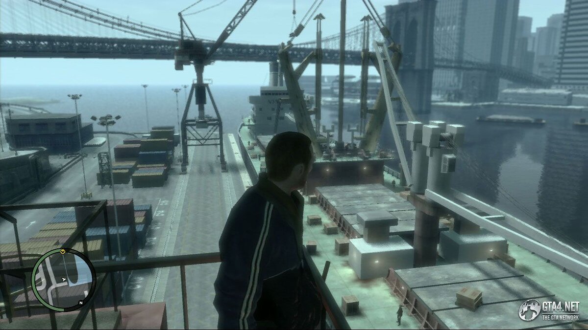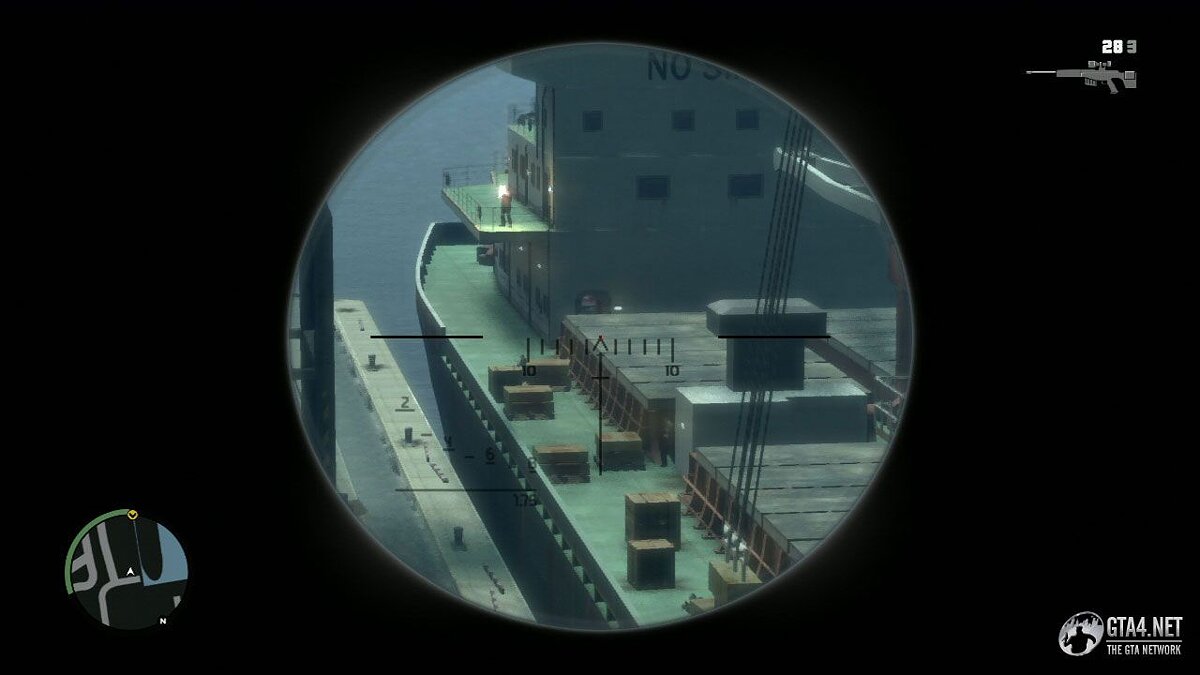 После заставки мост на радаре будет помечен желтым цветом. Корабль охраняется людьми Дмитрия, поэтому вам нужно найти винтовую лестницу, подняться наверх и расстрелять как можно больше охранников с безопасного расстояния, прежде, чем подниматься на палубу. Заберитесь на кран (3), который расположен рядом с кораблем. Оттуда будет видна практически вся палуба. Используйте снайперскую винтовку, чтобы убить охранников.