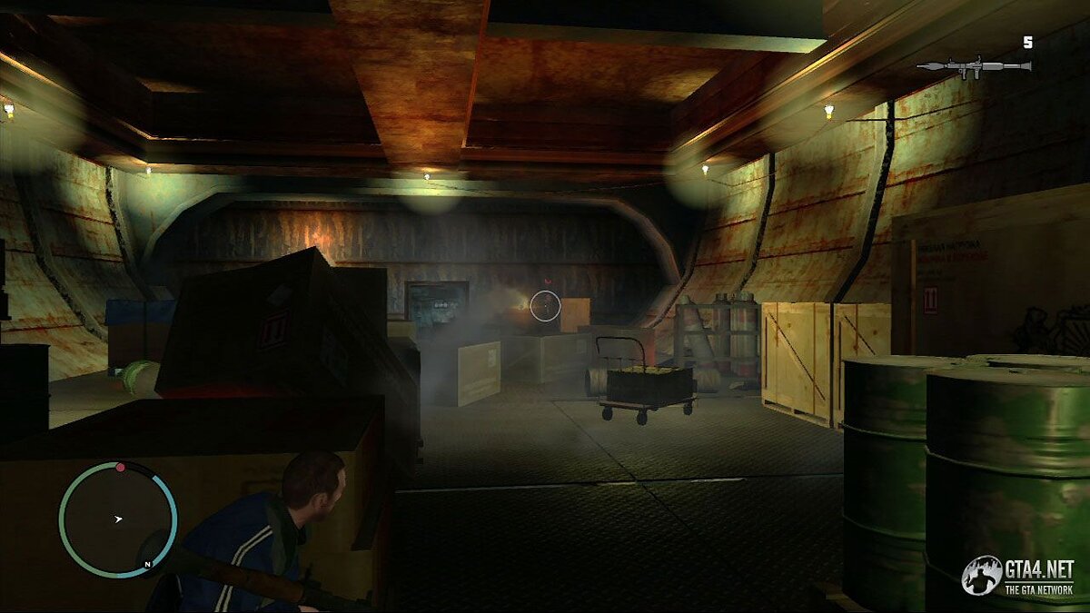 Помните — красный индикатор на радаре указывает на Дмитрия, он не указывает на вход в грузовой отсек (2). Вход в грузовой отсек находится немного дальше. Войдите в отсек и, спрятавшись за ящиками, уничтожьте всех охранников. Бегите за Дмитрием до появления заставки. После этого Дмитрий начнет прятаться за ящиками, а ему на помощь прибегут новые охранники.