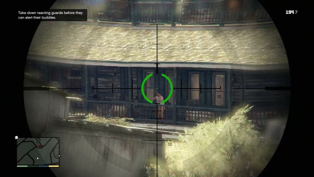 Когда вы убьете двух парней, стреляющих по банкам, посмотрите наверх и чуть вправо и убейте вот этого парня, пока он не закричал. Потом поднимите винтовку выше и убейте всех на балконе. Двигайтесь вниз и вправо от этой точки.