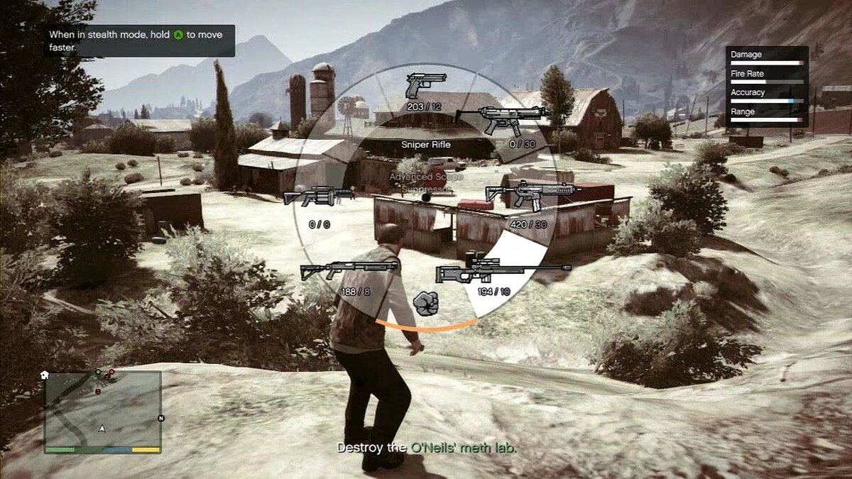 Езжайте на ферму О’Нила. Добравшись до этой точки обзора, выберите бесшумную снайперскую винтовку.