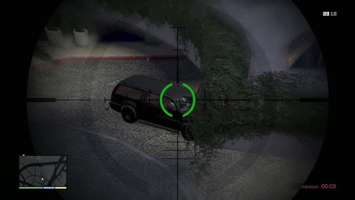 Как только запустится таймер, садитесь в машину и езжайте на верхний этаж парковки. Оказавшись наверху, подойдите к перилам и займите позицию, откуда хорошо видно охрану. Достаньте винтовку и застрелите мужчину в розовой футболке, когда он появится в поле зрения.