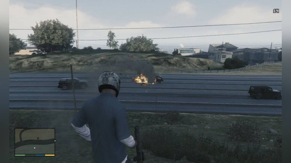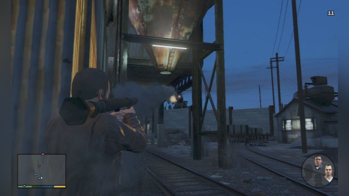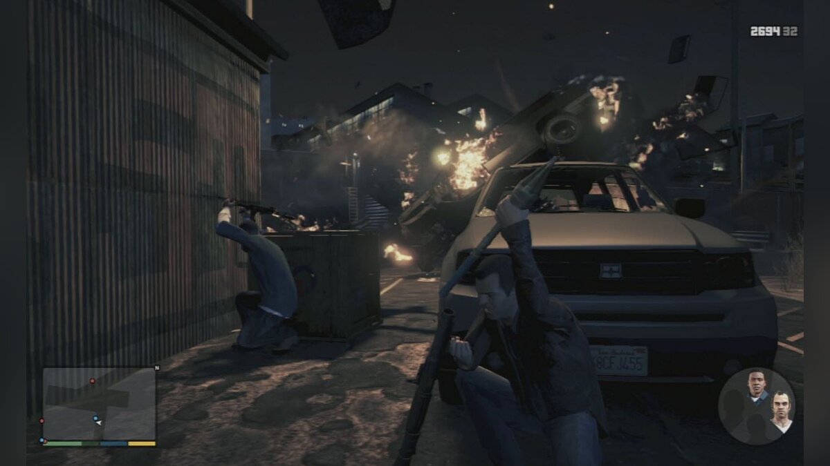 Бегите за Майклом и убейте бандитов, напавших на Франклина. Взорвите приближающиеся машины из гранатомета. Расчистите верхние уровни из пулемета.