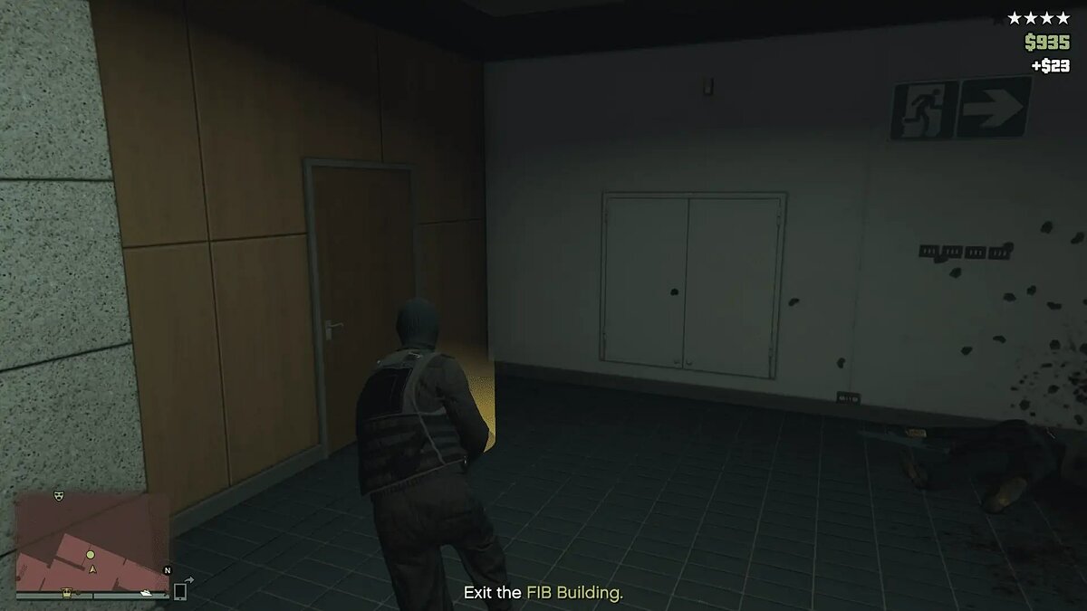 После этого нужно вернуться на крышу, чтобы сбежать. Убейте новую группу бойцов FIB, после чего двигайтесь в противоположный конец здания. Нужная дверь обозначена жёлтым маркером. Она выведет вас на балкон.